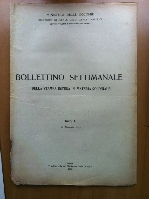 BOLLETTINO SETTIMANALEDELLA STAMPA ESTERA IN MATERIA COLONIALEMinistero delle Colonien^ 4 del 18 Febbraio 192219 pagine - formato 21,5x32 cmin buono stato salvo dorso danneggiato (55 g)E15825