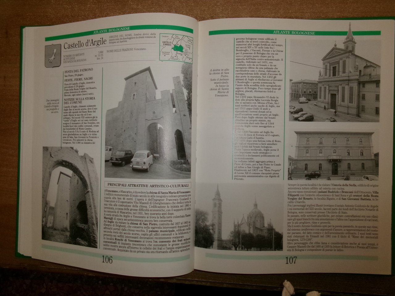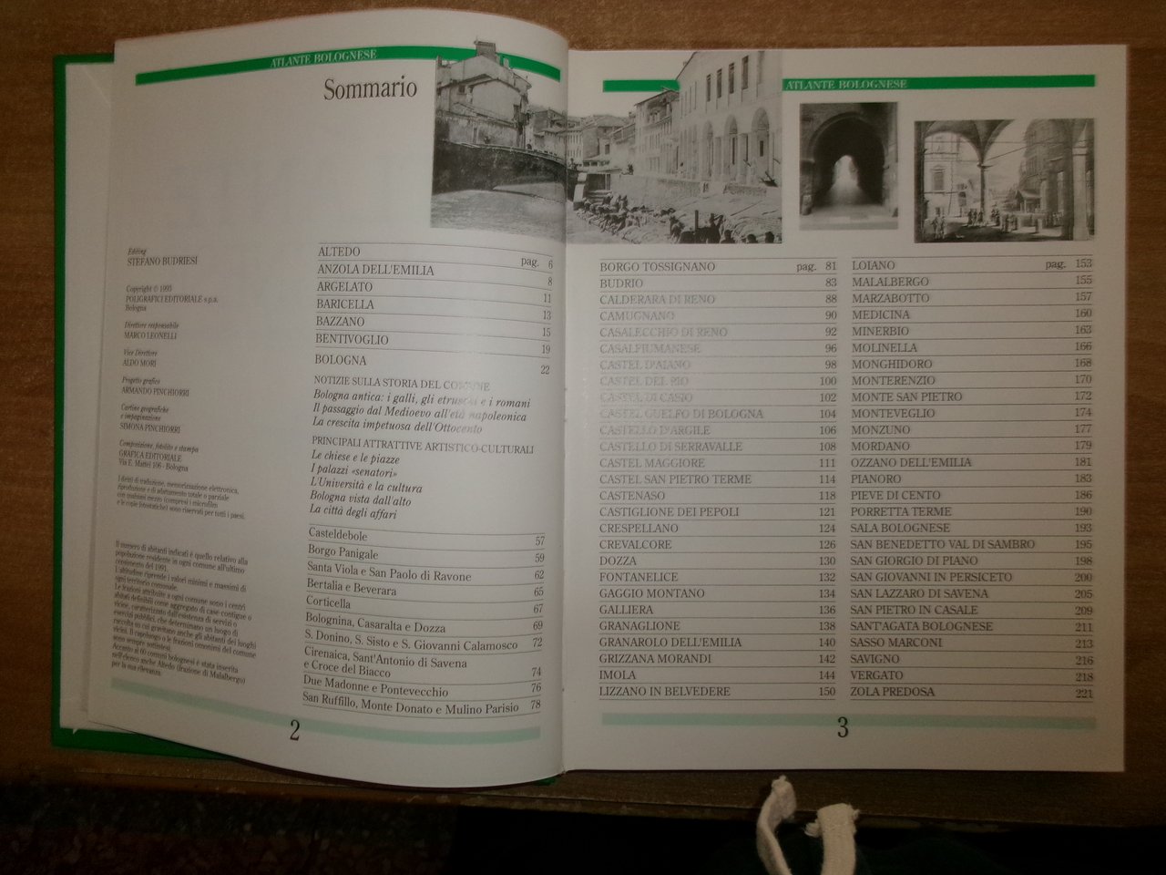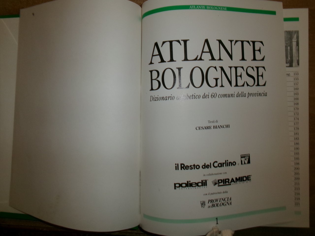 (Bologna) Testi di CESARE BIANCHI. Bologna, Grafica Editoriale, 1993. ATLANTE BOLOGNESE. Dizionario alfabetico dei 60 comuni della provincia. In-8° grande, cartonato edit. ill. a col. 224 pp. con numerose illustrazioni fotografiche in nero n.t. Come nuovo. Neg. mob. 22