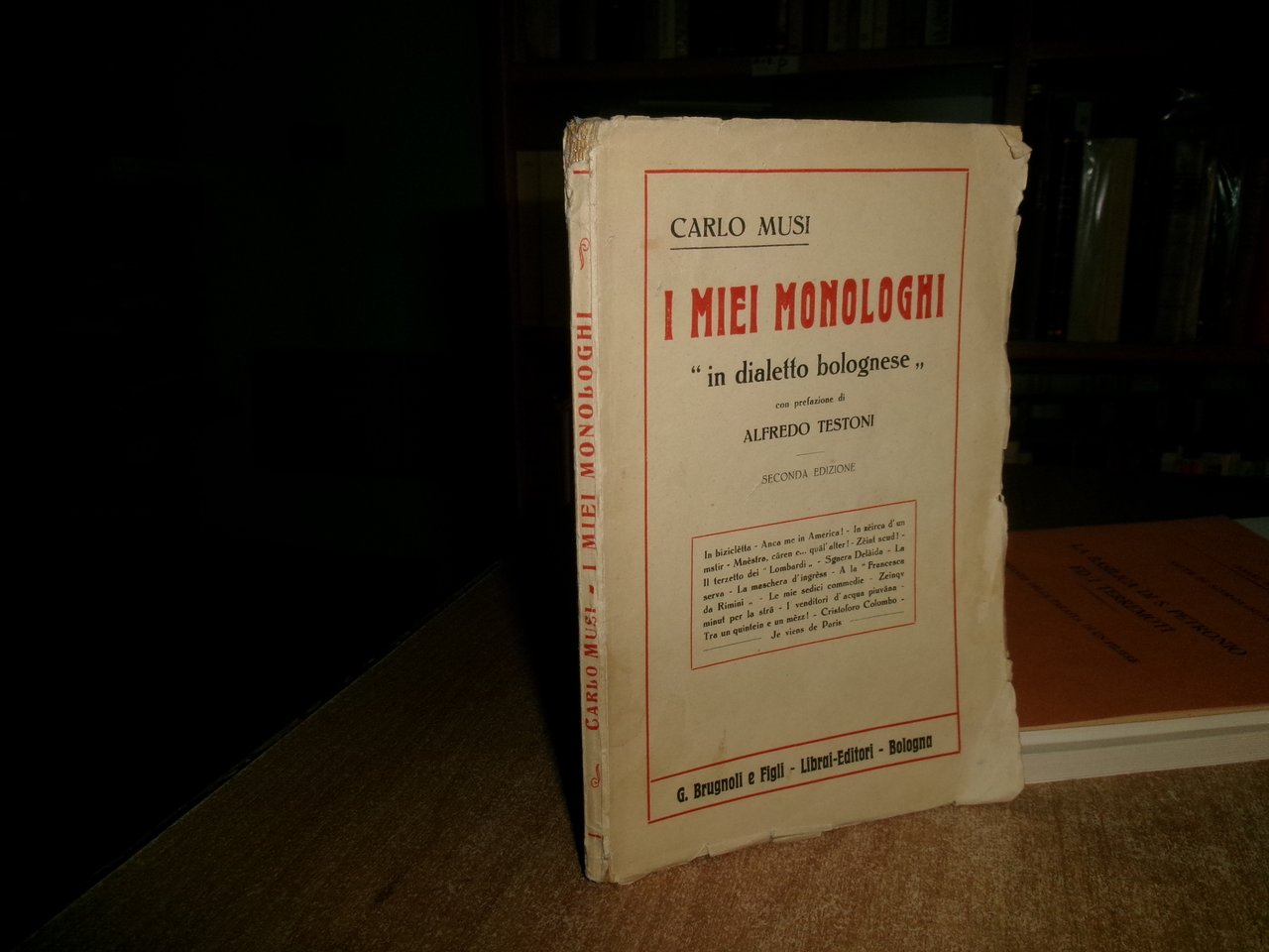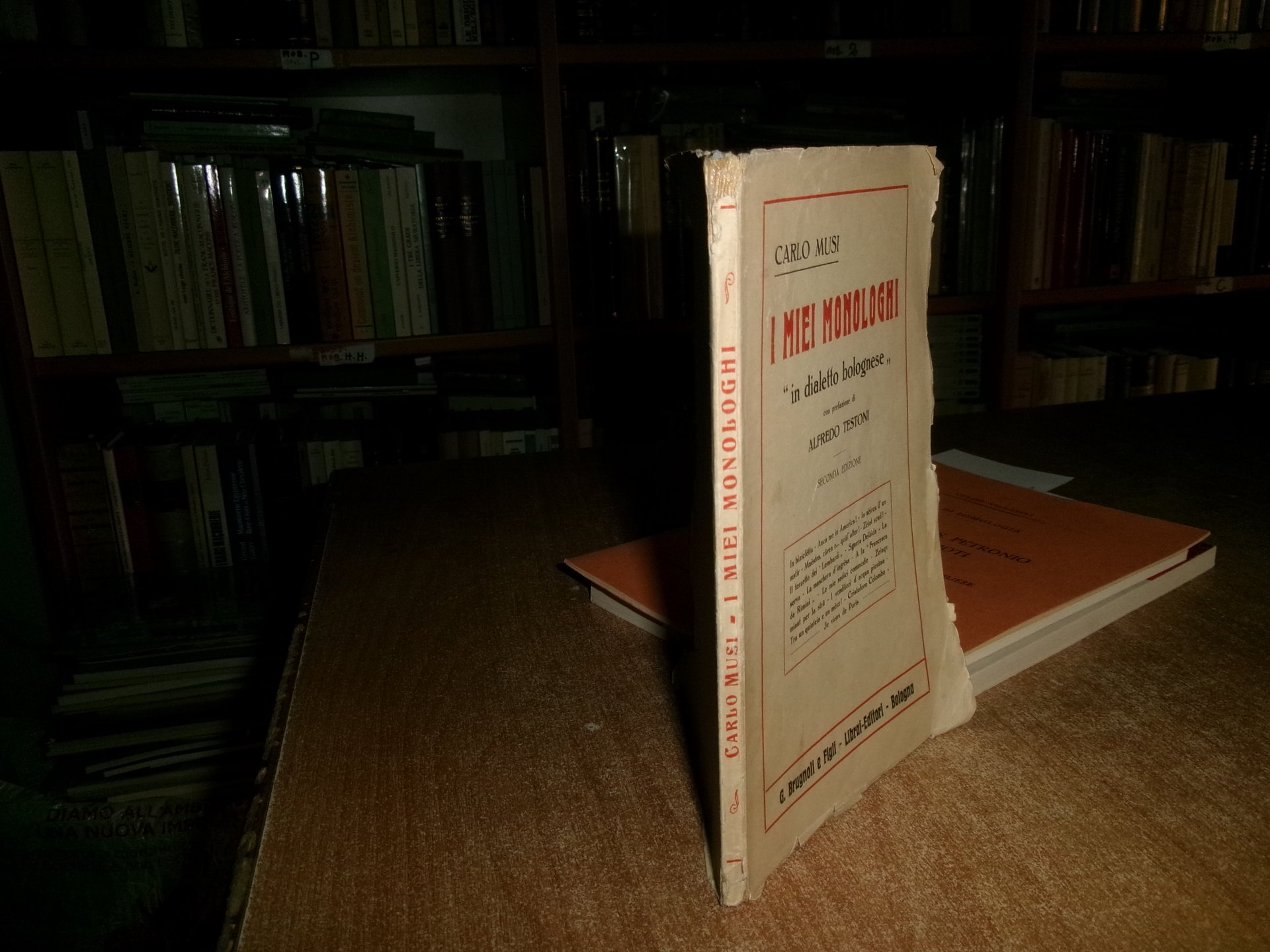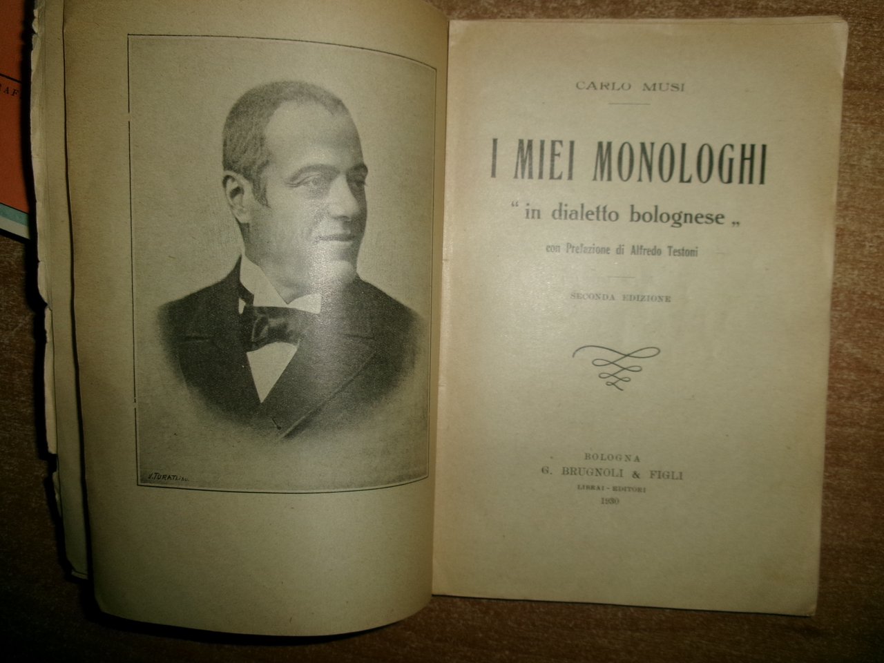 CARLO MUSI. Bologna, G. Brugnoli & Figli, 1930. I MIEI MONOLOGHI "in dialetto bolognese" seconda edizione. In-16° grande, br, orig. (cm. 19,5), (12) 123 (5) pp. con fotografie in nero nel testo. e un ritratto all'antiporta. Piccola mancanza angolare alla basa della brossura posteriore (come da foto) peraltro esemplare ben conservato.