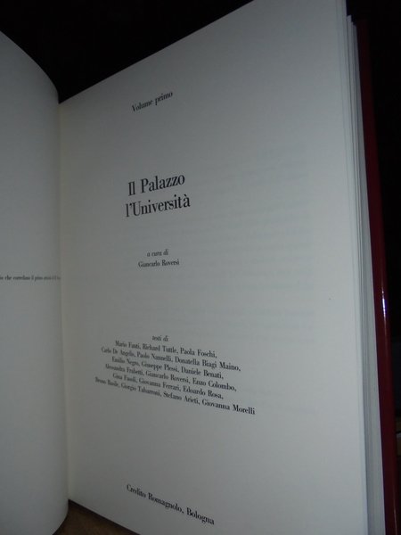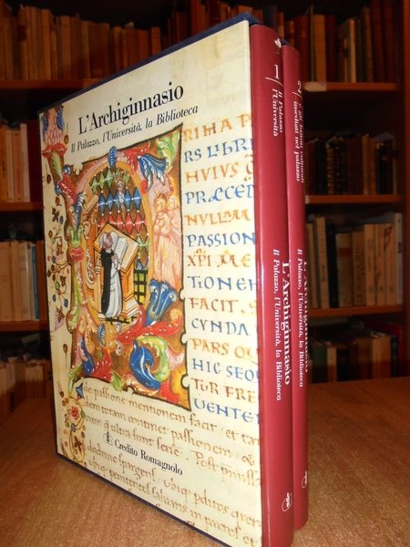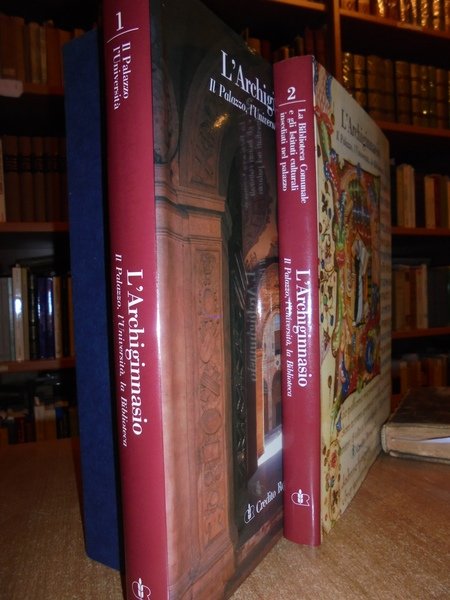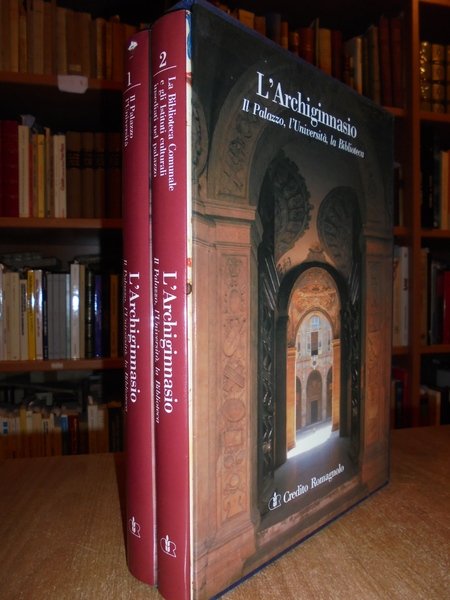 A cura di Giancarlo Roversi. Bologna, (Casalecchio), Grafis per Credito Romagnolo, 1987. L' ARCHIGINNASIO. Il Palazzo, L' Università, La Biblioteca. Testi di Autori vari. 2 volumi in-4°, tela edit. con titoli in oro sui piani e ai dorsi con le sovracopertine. Complessive 743 pp. con numerose illustrazioni a colori e in bianco e nero n.t. Esemplare in cofanetto illustrato in cartone rigido. Come nuovo. Neg. Bol. altro esemolare Uff. (carc) mob. TV altracopia uff. TV. mob fronte nostro