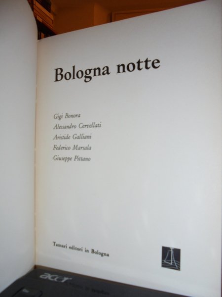 Bonora-Cervellati-Galliani-Marsala-Pittano. Bologna, Tamari Editori, 1971. BOLOGNA notte. In-8°, cartoncino edit. con risvolti. 148, (1) pp. con illustrazioni in bianco e nero nel testo. Lievi segni d' uso ma ben conservato. Neg. Bol. mob. 20