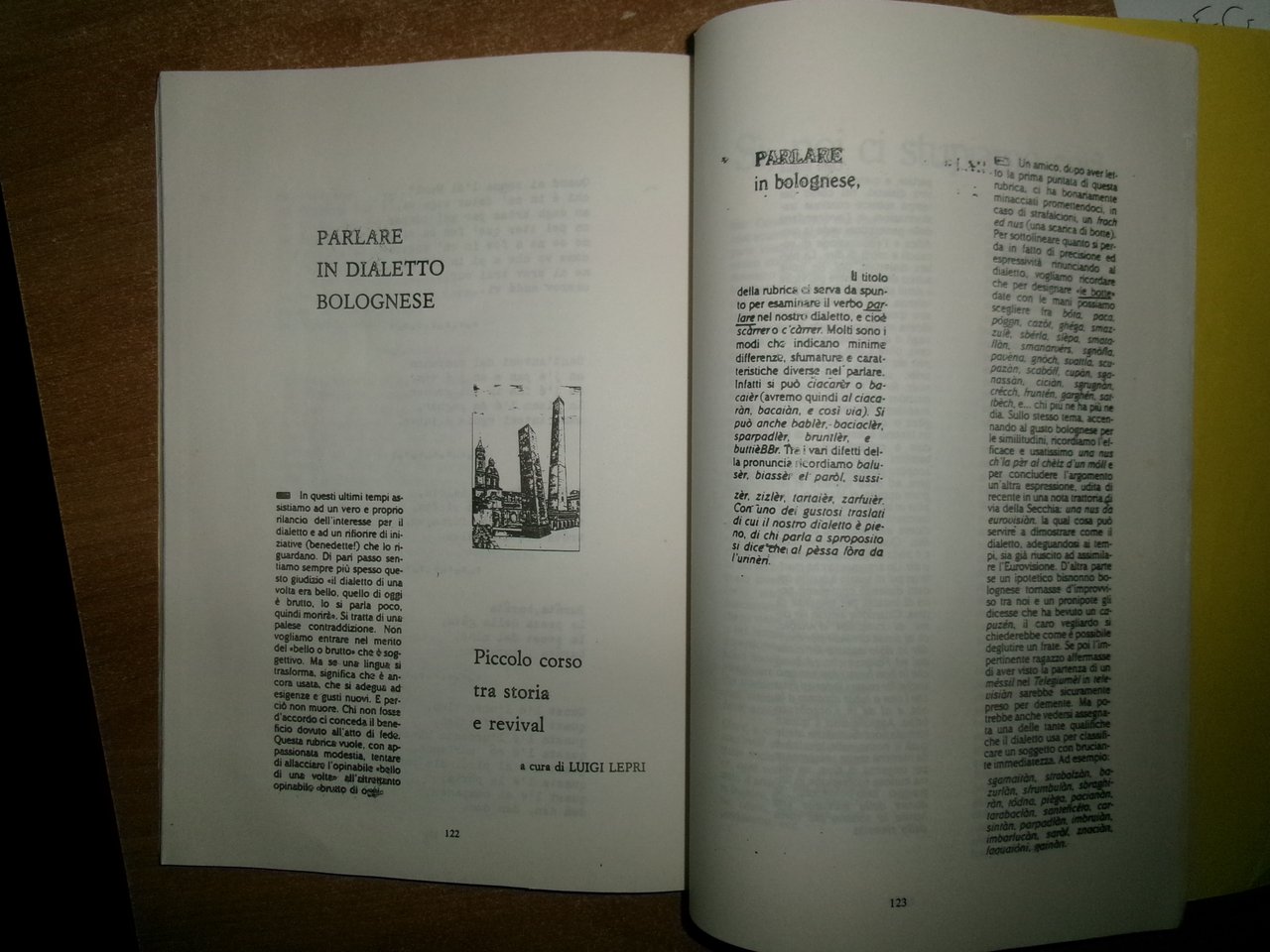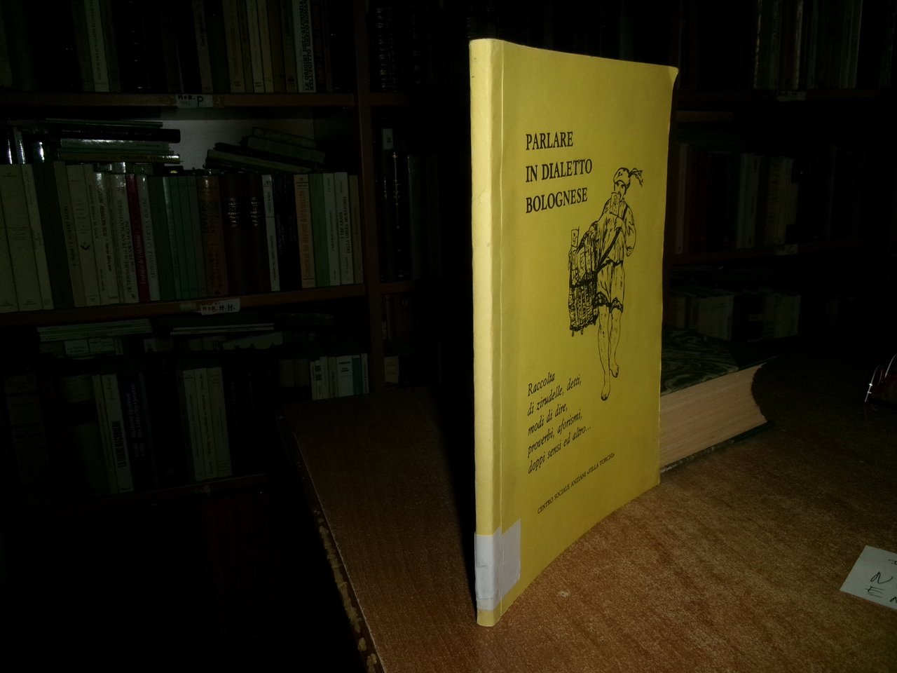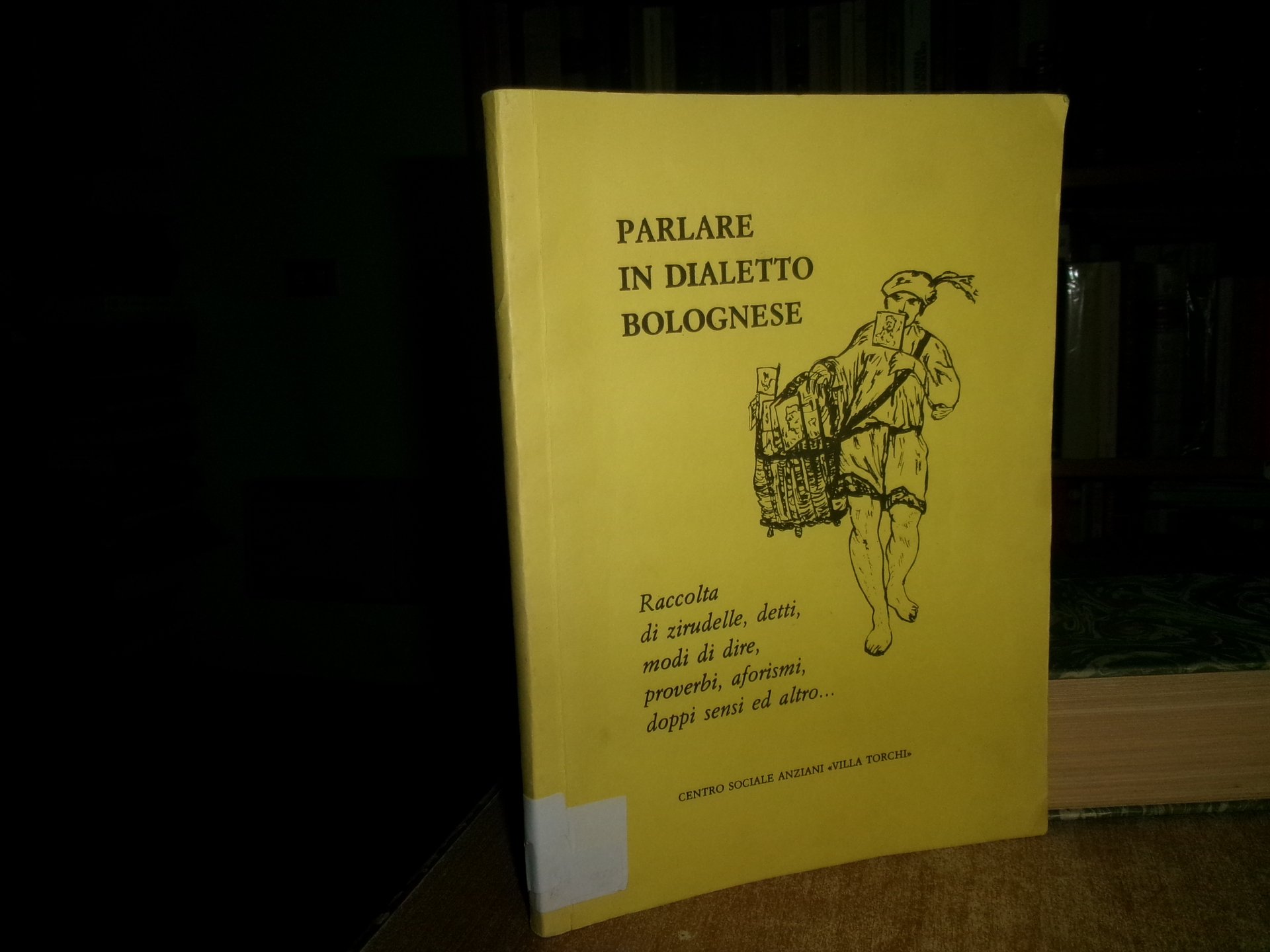 (Bologna) Parlare in dialetto bolognese. Raccolta di zirudelle, detti, modi di dire, proverbi, aforismi, doppi sensi ed altro... Bologna, Centro Sociale Anziani << Villa Torchi >>. In-8° grande, br. 156 pp. con alcune illustrazioni n.t. L' indice sembra dattiloscritto. E' presente un' etichetta alla base del dorso e numero nella pagina di presentazione. Neg. Bol. mob. B entro busta trasp.