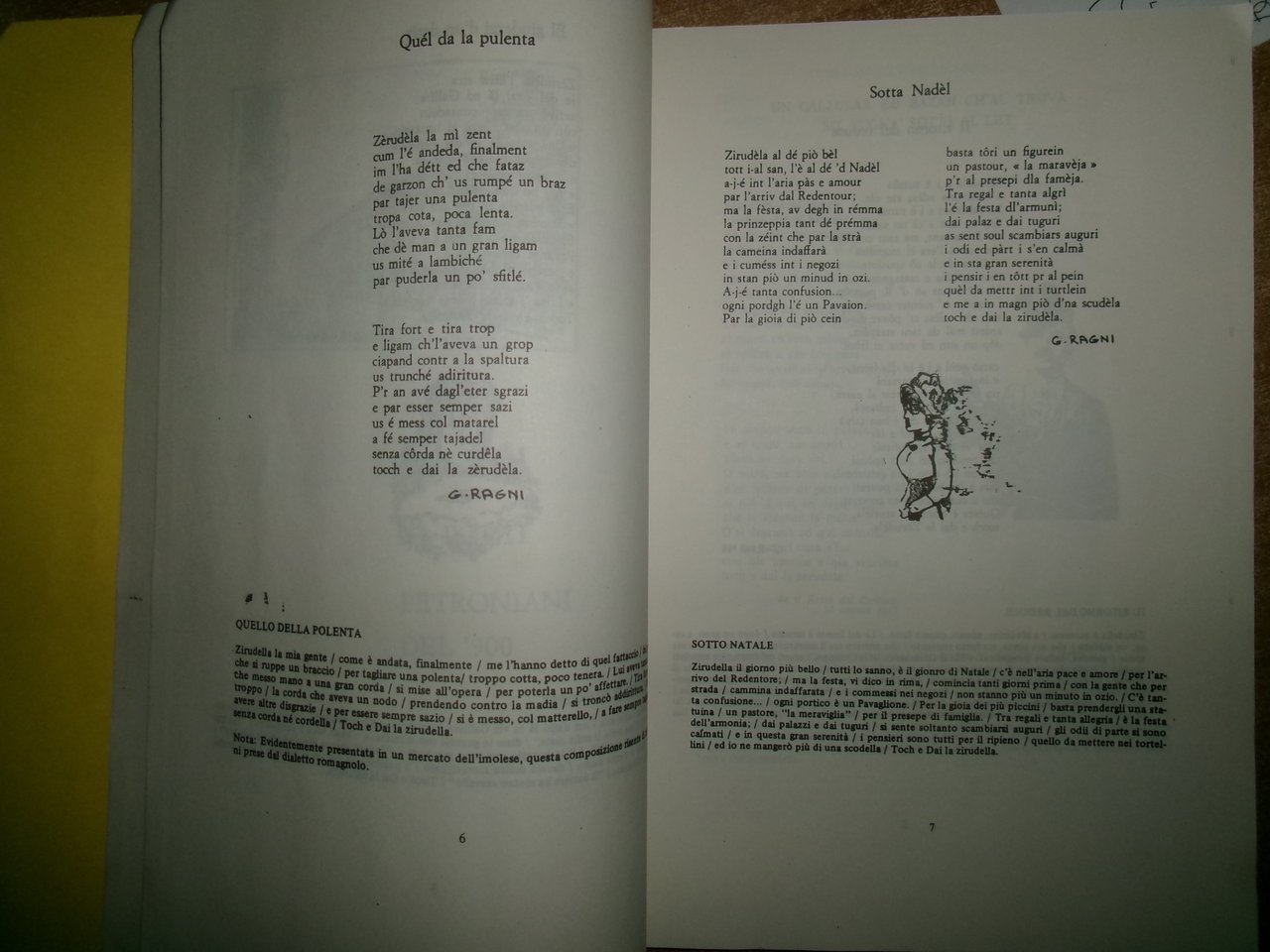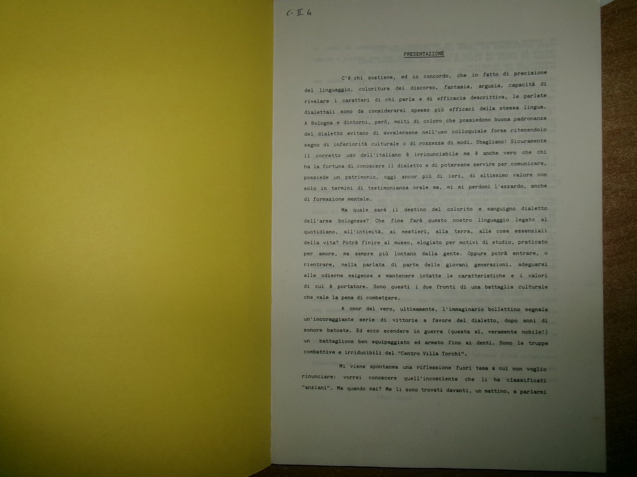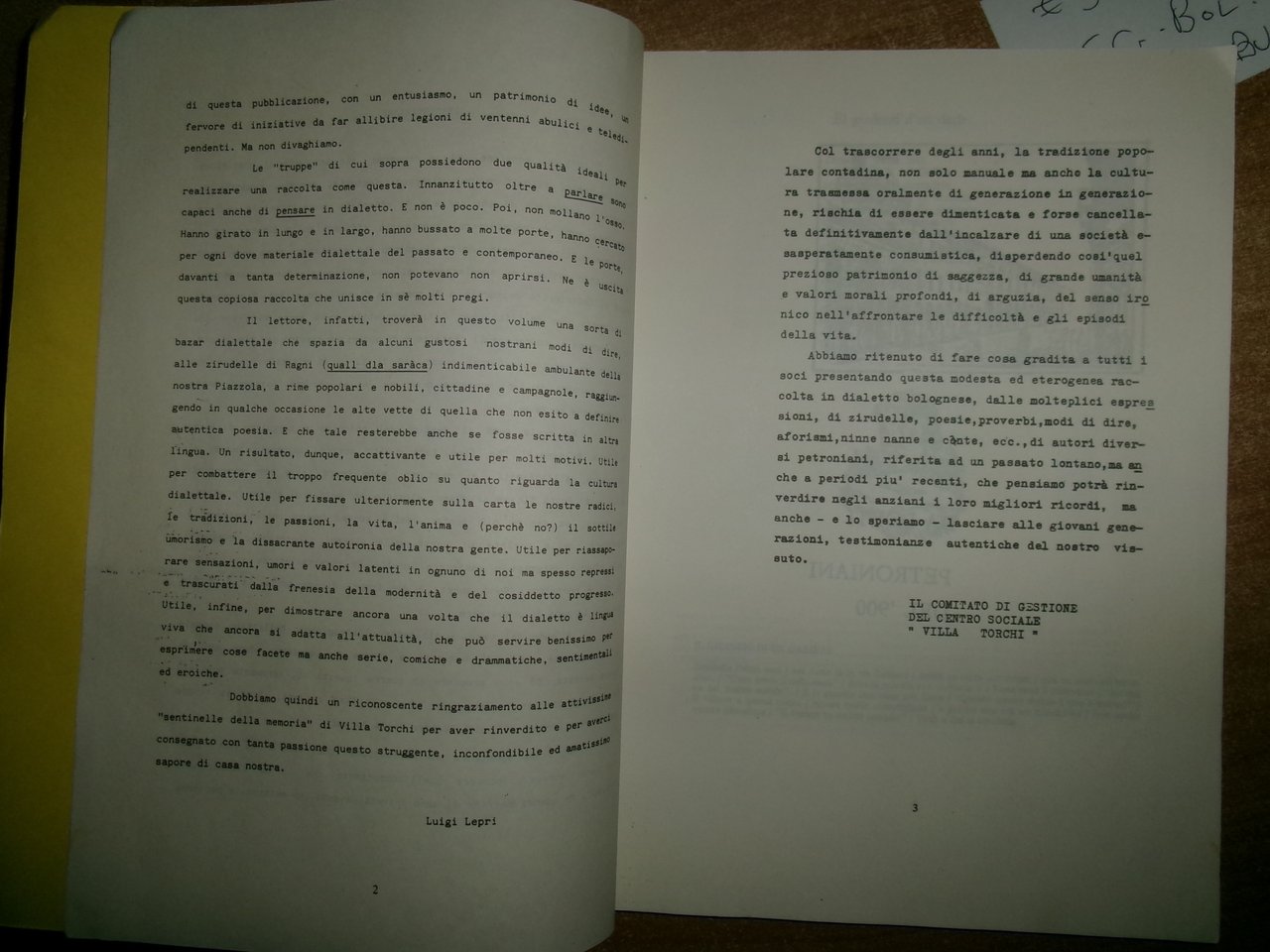 (Bologna) Parlare in dialetto bolognese. Raccolta di zirudelle, detti, modi di dire, proverbi, aforismi, doppi sensi ed altro... Bologna, Centro Sociale Anziani << Villa Torchi >>. In-8° grande, br. 156 pp. con alcune illustrazioni n.t. L' indice sembra dattiloscritto. E' presente un' etichetta alla base del dorso e numero nella pagina di presentazione. Neg. Bol. mob. B entro busta trasp.