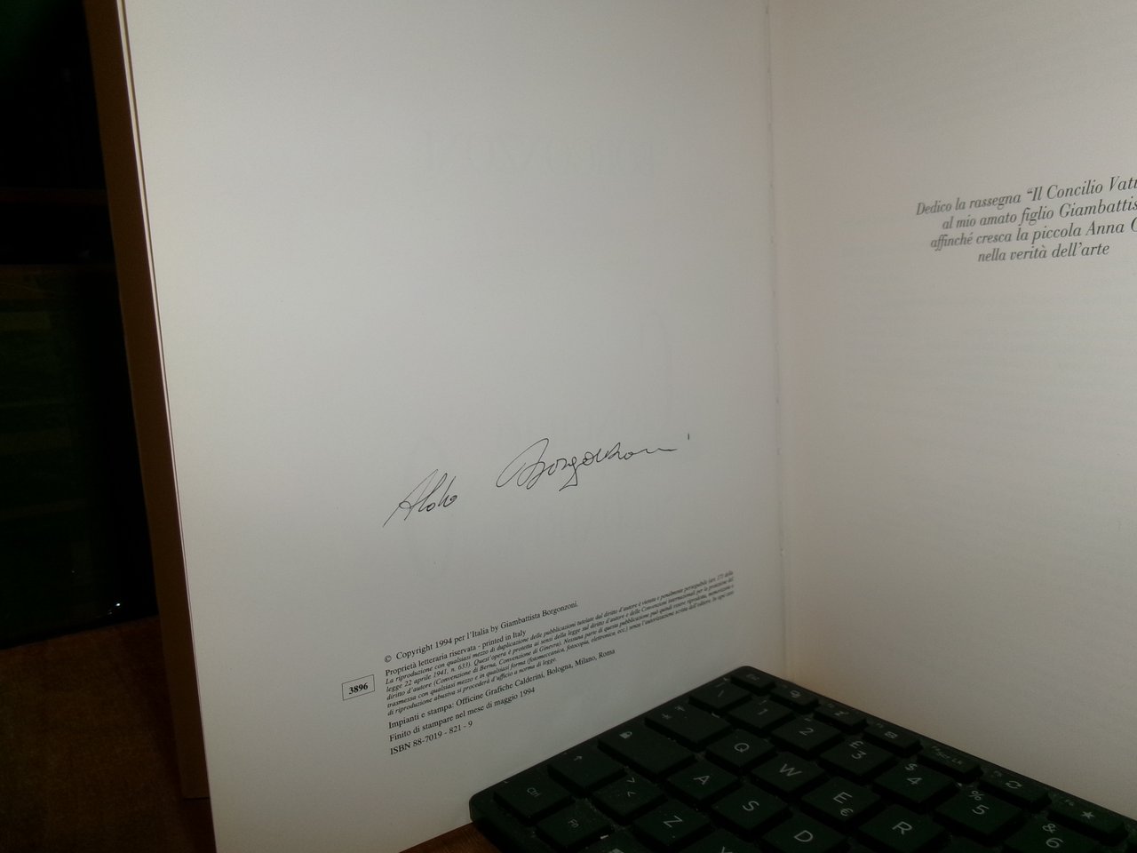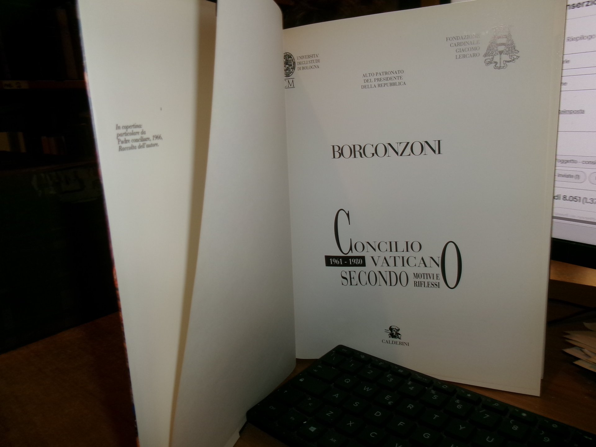 BORGONZONI Concilio Vaticano Secondo motivi e riflessi 1961-1980. Bologna, Calderini, 1994. In-8° grande, tela nera edit. con titoli impressi, sovracopertina ill. a col. 271 pp. con numerose illustrazioni a colori e in bianco e nero n.t. Come nuovo firmato dall' Autore al retro del frontespizio. Neg. mob. 11