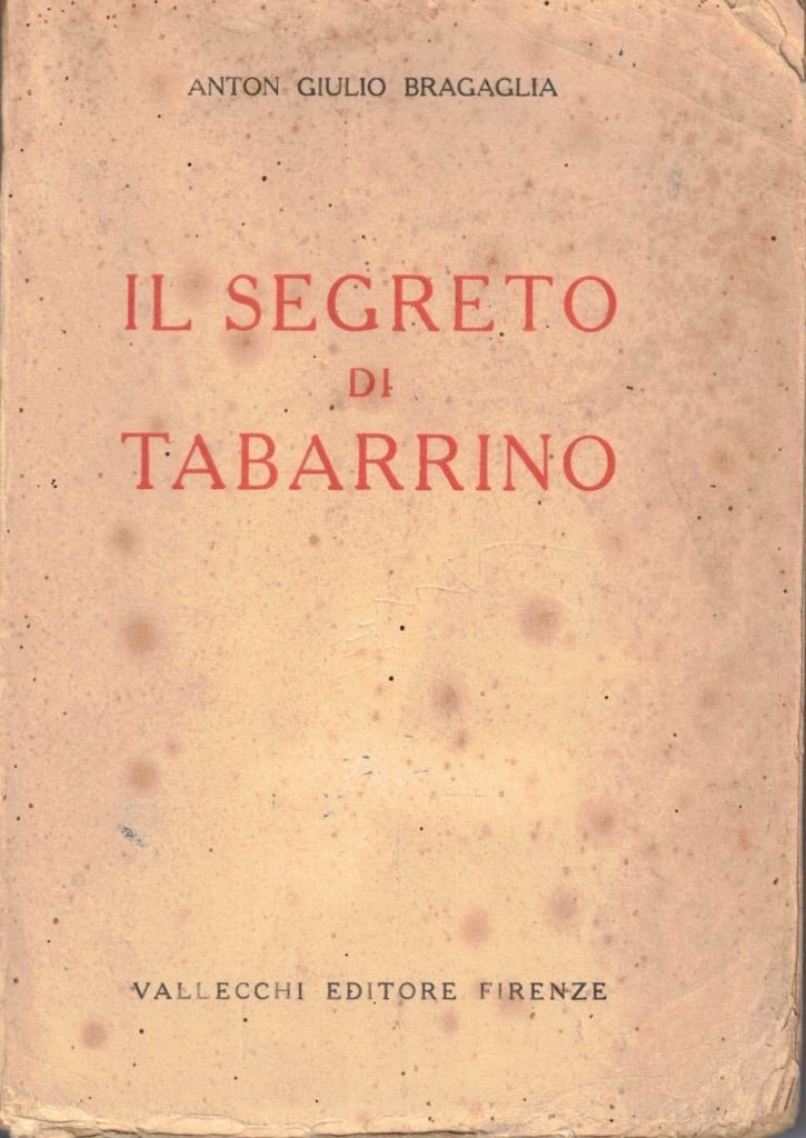Anton Giulio Bragaglia, Il segreto di Tabarrino, Vallecchi Editore, Firenze 1933, pp. 265, cm 20, br. ed. Tracce d’uso alla brossura, vecchio rinforzo in carta a una cerniera interna, minime fioriture, per il resto buona copia con interno pulito e ben tenuto. Intonso.