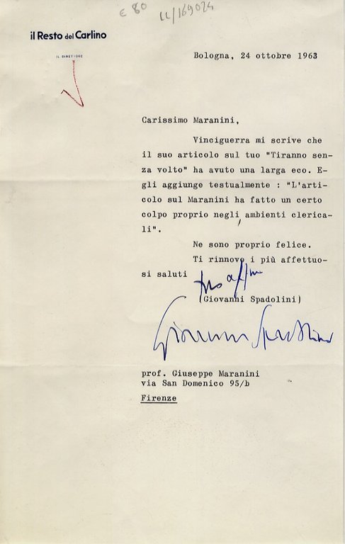 Breve lettera con firma autografa, dattiloscritta su una facciata di un foglio intestato "Il Resto del Carlino", datata "Bologna, 24 ottobre 1963", indirizzata al professor Giuseppe Maranini, a Firenze: "Carissimo Maranini, Vinciguerra mi scrive che il suo articolo sul tuo Tiranno senza volto ha avuto una larga eco [.]".