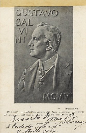 Breve messaggio autografo firmato, steso sul margine bianco basso d'un cartoncino che reca la riproduzione del medaglione eseguito da Alessandro Massarenti raffigurante lo stesso Salvini; indirizzato - data la provenienza - a Nello Puccioni: "Ricordo di Gustavo Salvini a bordo del Savoia. 21 agosto 1907".