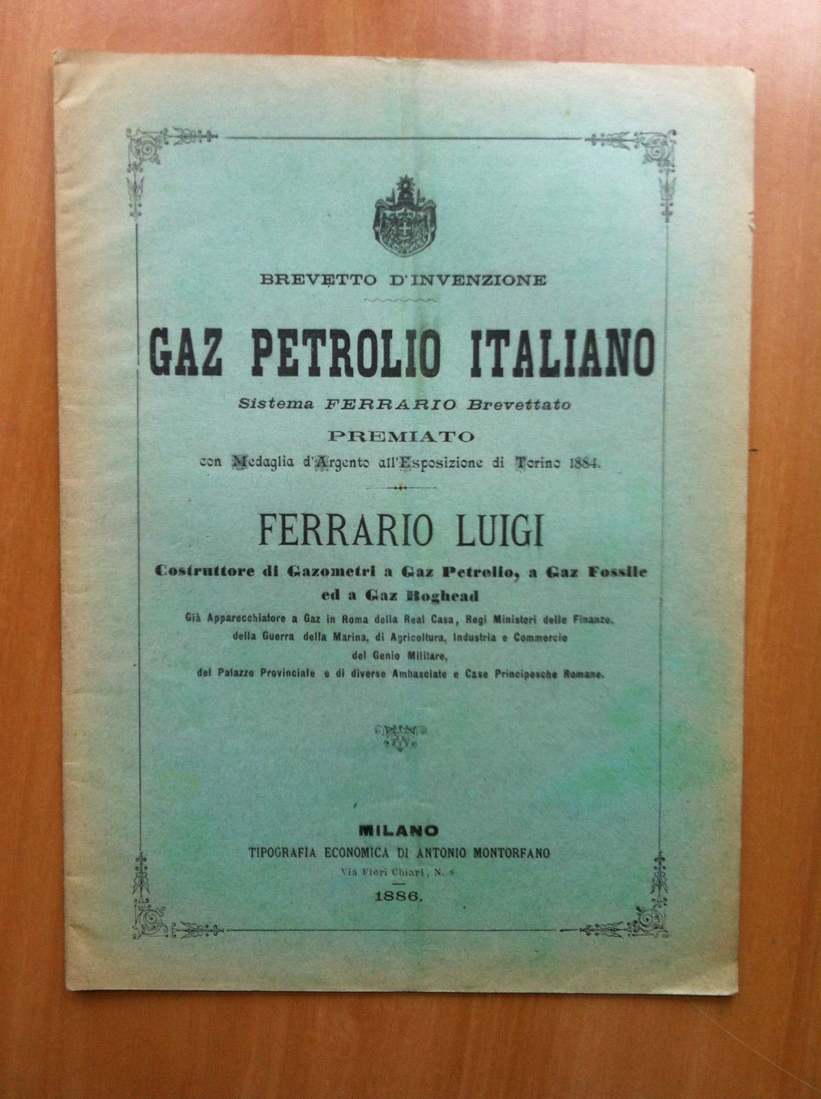 brevetto d'invenzioneGAZ PETROLIO ITALIANOSistema FERRARIO brevettato premiato con Medaglia d'Argento all'Esposizione di Torino 1884FERRARIO LUIGIMilano 188619 pagine - formato 17x23,5 cm in ottimo stato (35 g)E15714