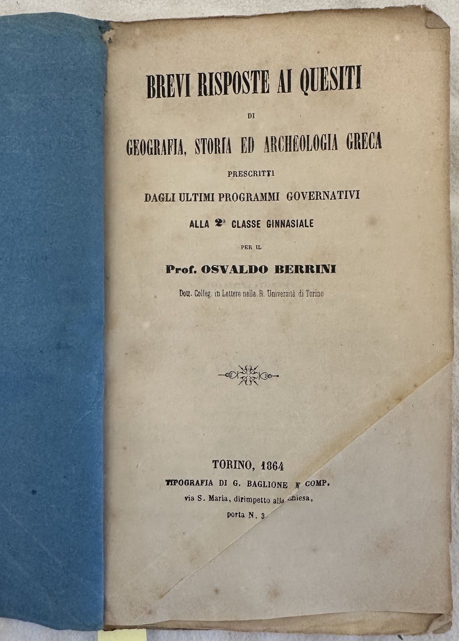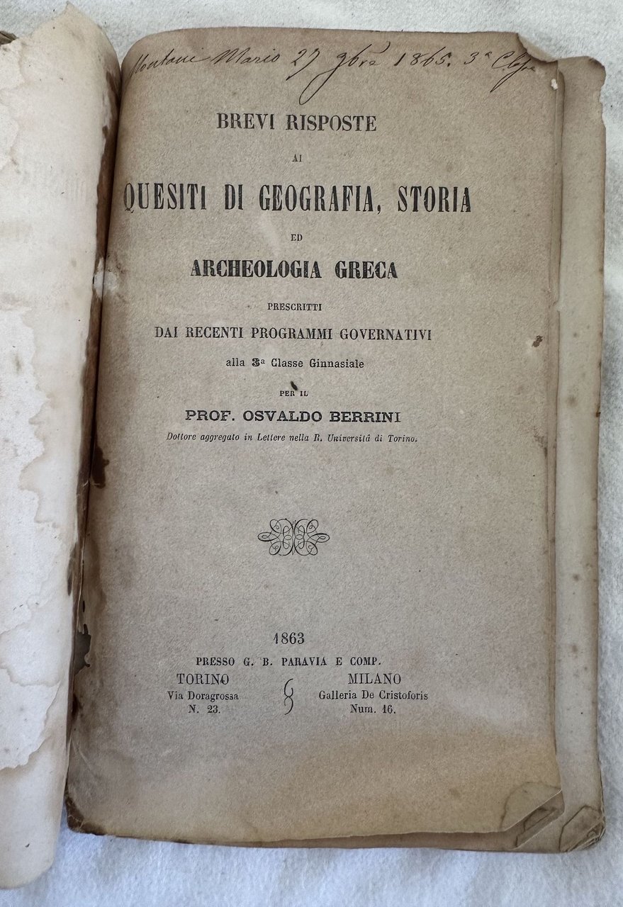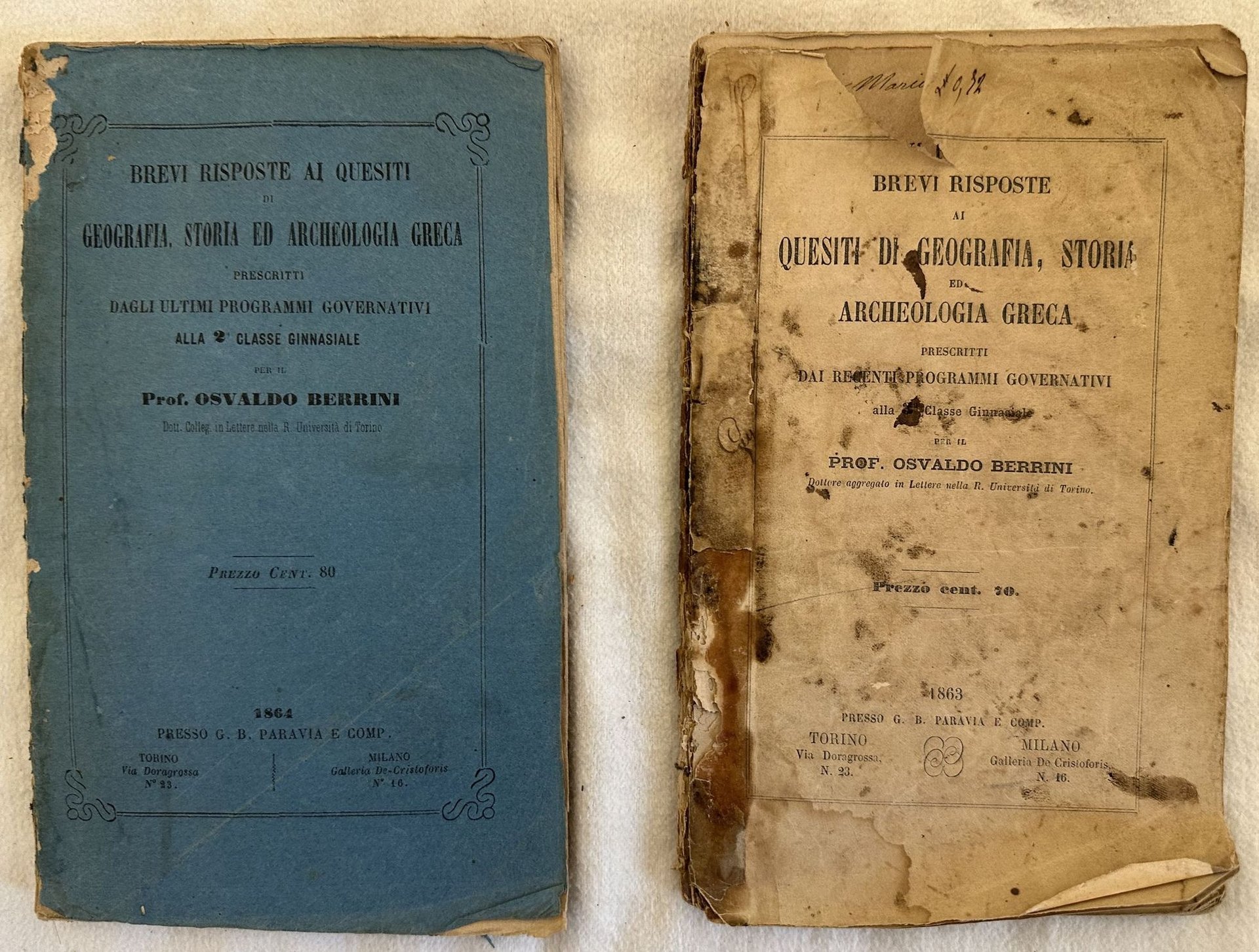 Edizione del 1864 di questo manuale di geografia storia ed archeologia greca di Osvaldo Berrini. Siamo in possesso dei due volumi relativi alla seconda e terza ginnasiale. All'interno elementi di geografia fisica, Genti primitive Elleniche, Religione, Antichi vincoli di nazionalità presso i greci, Invasione Dorica, Sparta, Le tre guerre messeniche, Aristodemo, Aristomene, Tirteo, Giochi pubblici, Atene , Dracone, Solone, Colonie greche, Incendio di Sardi, La grande spedizione di Serse, Battaglia di Platea, Pausania, Educazione, ginnastica, palestre, costumi ed usanze, teatro ec. Antica firma al frontespizio datata 1865. In discrete condizioni. Copertina editoriale in discrete condizioni con lievi usure ai margini e dorso. Legatura in discrete condizioni con rotture. Pagine in buone condizioni. In 8. cm. 20x12. Pp. 86+(2), 62. Edition of 1864 of this manual of tgreek geography history and archeology written by Osvaldo Berrini. We have the two volumes relating second and third year of high school. Antique signature in the title page dated 1865 In fair conditions. Editorial cover in fair conditions lightly worn in the extremities. Binding in fair conditions with cracks. Pages in good conditions. In 8. cm. 20x12. Pp. 86+(2), 62.