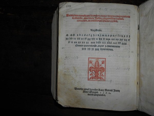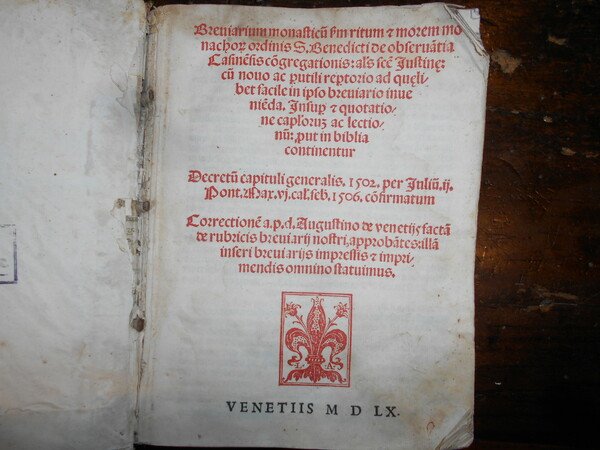 BREVIARIUM O.S.B.MONASTICUM RITUM ET MOREM MONACHORUM ORDINIS S. BENEDICTI DE OBSERVANTIA CASINENSIS CONGREGATIONIS ALIAS SANCTAE JUSTINAE DECTRETUM CAPITULI GENERALIS 1502 PER JULIUM II PONT. MAX. VI CAL. FEB. 1506 CONFIRMATUM.
