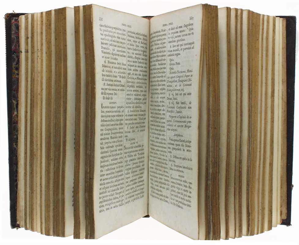 (Codice AN/3343) In 8° LXXII-729(1)-CCCXII-66 pp. Frontespizio con antico timbro ex libris. Testo in latino, su 2 colonne. Applicato alla sguardia un foglio manoscritto della Tabula horarum. Legatura originale in piena pelle con fregi e titolo oro al dorso, copertine decorate a secco, cornici e dentelle oro, tre tagli oro. Bruniture marginali alle prime carte, volume usato, solido e ben conservato. Rarissimo esemplare munito di un'antica originale sovraccoperta in pelle, orli sporgenti, con fermaglio in ottone, grande lembo di chiusura (gancetto mancante). ~~~ SPEDIZIONE IN ITALIA SEMPRE TRACCIATA
