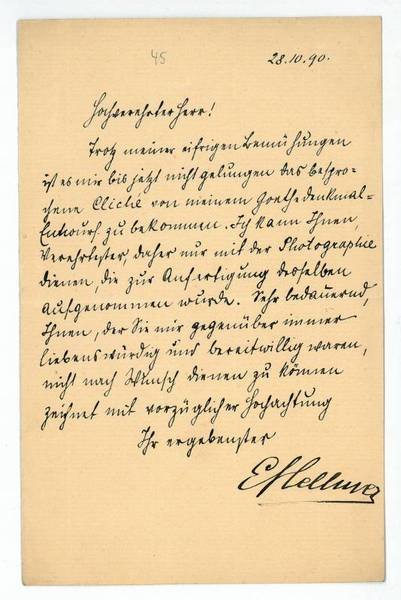 1 S. auf Doppelblatt. 8vo. An einen namentlich nicht genannten Adressaten: "Trotz meiner eifrigen Bemühungen ist es mir bis jetzt nicht gelungen das besprochene Cliché von meinem Goethe Denkmal-Entwurf zu bekommen. Ich kann Ihnen, Verehrtester, daher nur mit der Photographie dienen, die zur Anfertigung desselben aufgenommen wurde [.]". - Hellmer, der zu den bedeutendsten historistischen Bildhauern Österreichs zählt, war nach 1870 ununterbrochen mit Arbeiten für zahlreiche repräsentative Gebäude der Ringstraße (Universität, Rathaus und Parlament), für die Hofburg (Monumentalbrunnen an der zum Michaelerplatz gelegenen Fassade) sowie mit der Arbeit an Portraitbüsten und (Grab-)Denkmälern (u. a. Johann Strauß-Denkmal, Grabdenkmäler für Hans Makart und Hugo Wolf) beschäftigt.