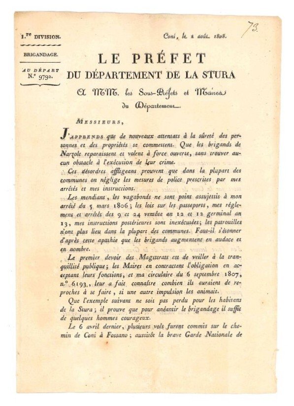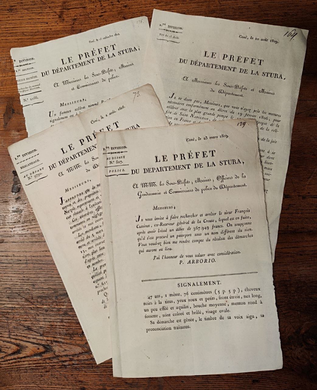 Lotto di 4 bandi del Dipartimento de la Stura. Tre sono dei fogli volanti, uno è un bifolio (ca. mm. 297x201). Con note manoscritte marginali. Ottimo stato di conservazione.
