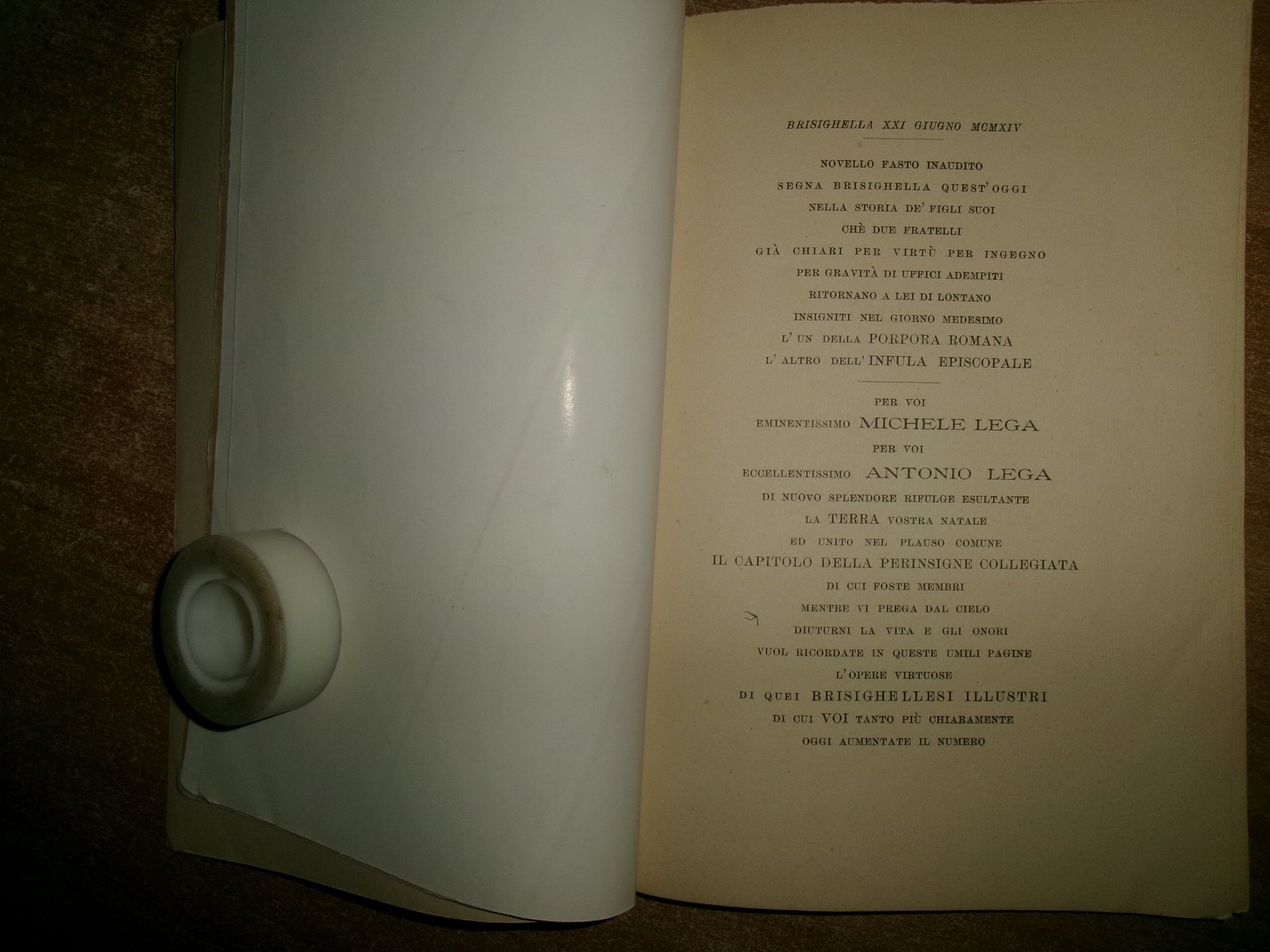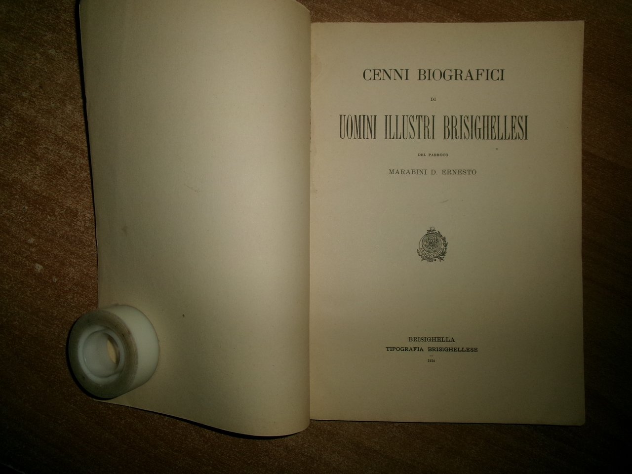 MARABINI D. ERNESTO. Brisighella, Tipografia Brisighellese, 1914. CENNI BIOGRAFICI di UOMINI ILLUSTRI BRISIGHELLESI. In-8°, br. orig. 84, (1) pp. con due tavole f.t. (una protetta da velina trasparente). Uff. A - II - 3 - 2