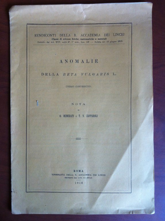 Brossura originaleAnomalie della Beta Vulgaris L.O. Munerati, T.V. Zapparoli1916Rendiconti della Regia Accademia dei Lincei8 pagine intonse - formato 19x27,5 cmin ottime condizioni (25 g)E17845