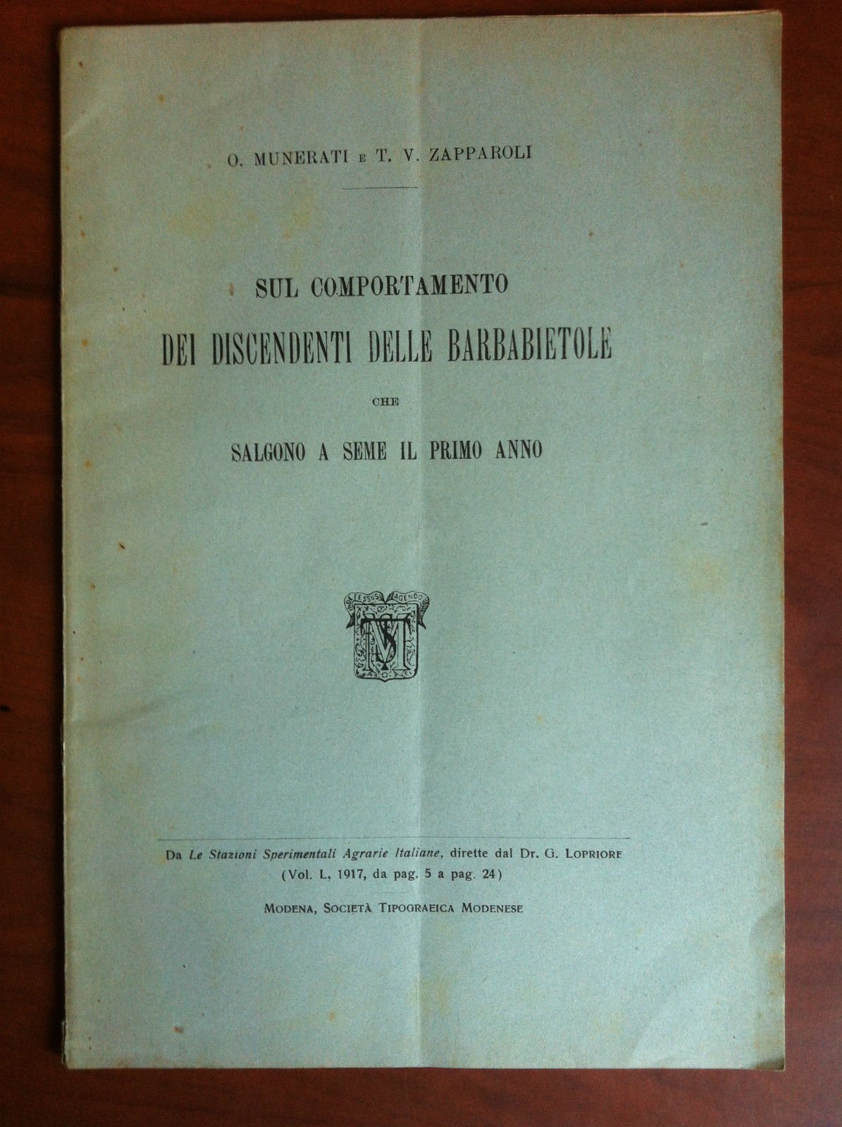 Brossura originaleSul comportamento dei discendenti delle barbabietole che salgono a seme il primo annoO. Munerati, T.V. Zapparoli191728 pagine - formato 17x24,5 cmin ottime condizioni (65 g)E17843