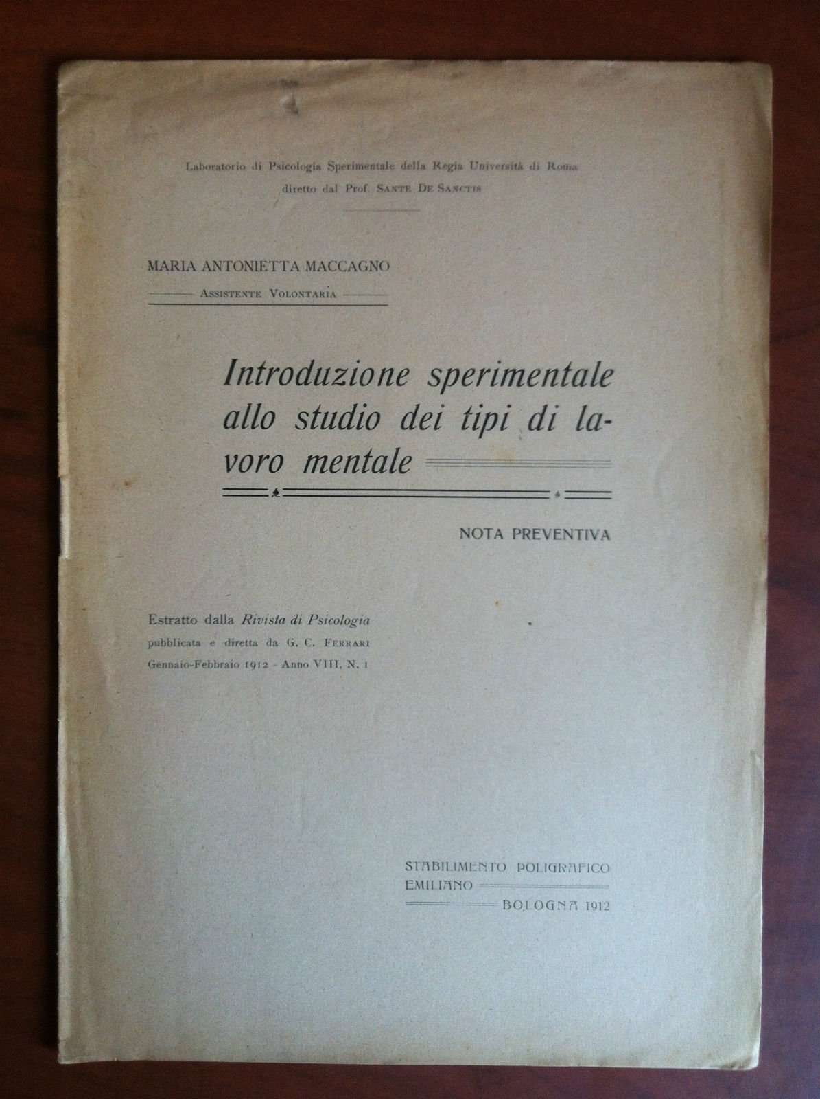 Brossura originaleIntroduzione sperimentale allo studio dei tipi di lavoro mentaleMaria Antonietta MaccagnoIstituto di Psicologia Sperimentale della Regia Università di Romadiretta dal Prof. Sante De SanctisEstratto dalla Rivista di Psicologia 191211 pagine - formato 17x24,5 cmin ottime condizioni (20 g)E17810