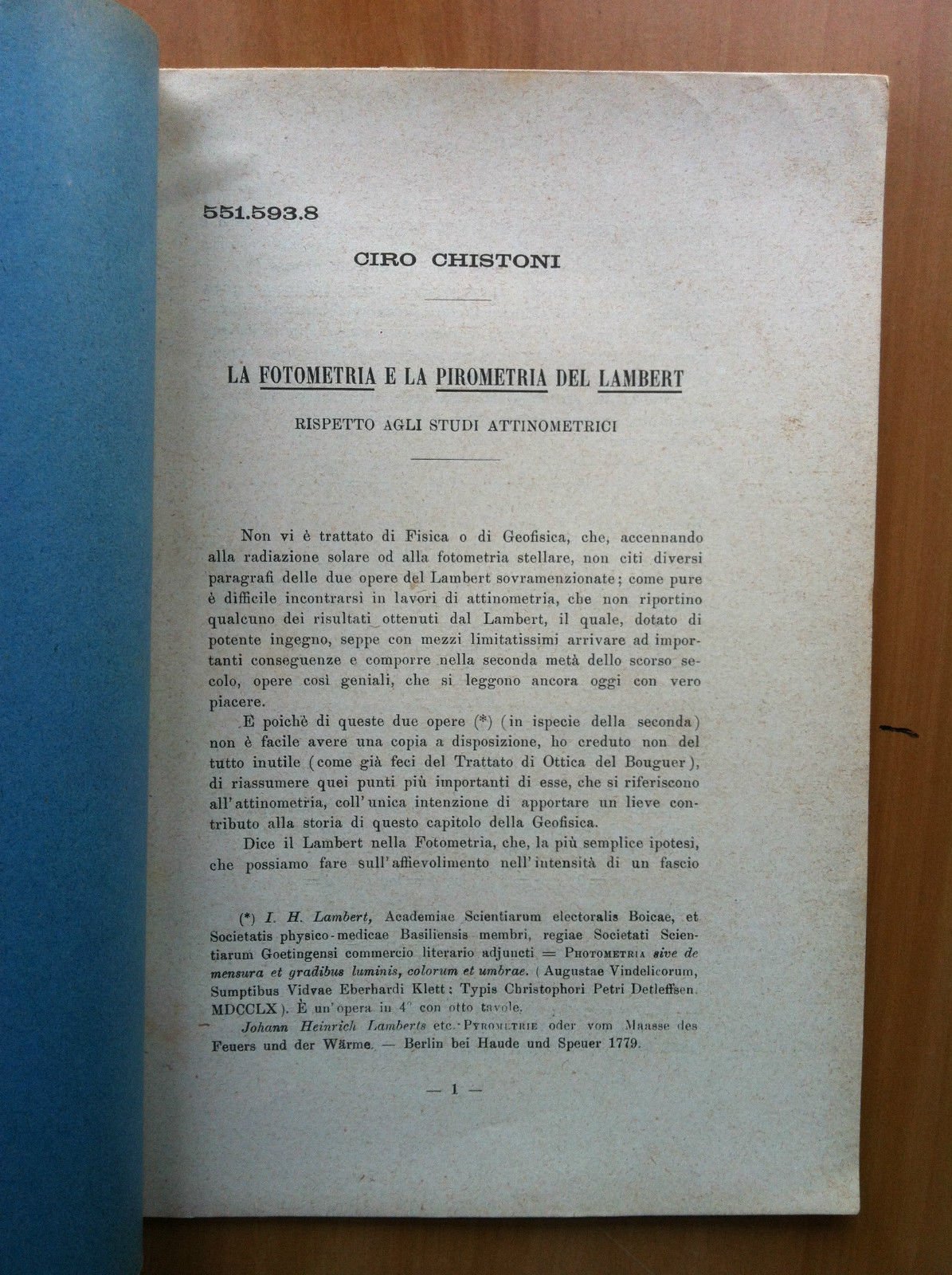LA FOTOMETRIA E LA PIROMETRIA DEL LAMBERTRISPETTO AGLI STUDI ATTINOMETRICICiro Chistoni 189923 pagine intonse - formato 15,5x23 cm in ottimo stato (gr. 40)E15773