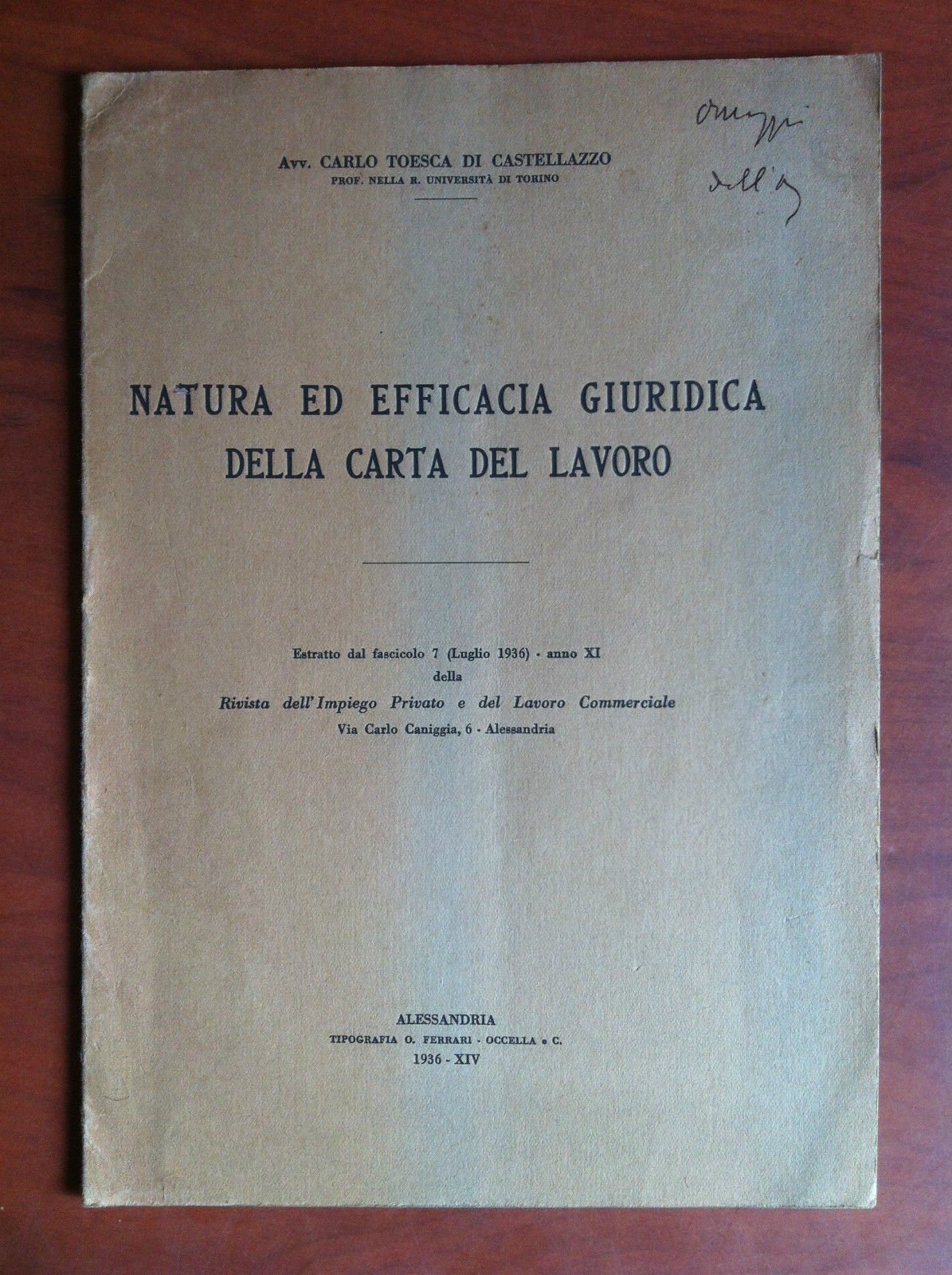 NATURA ED EFFICACIA GIURIDICA DELLA CARTA DEL LAVOROEstratto dal fascicolo 7 (Luglio 1936) anno Xi della Rivista dell'Impiego Privato e del Lavoro CommercialeAvv. Carlo Toesca di Castellazzo8 Pagine - Formato 17x24 cm (30 g)E18690