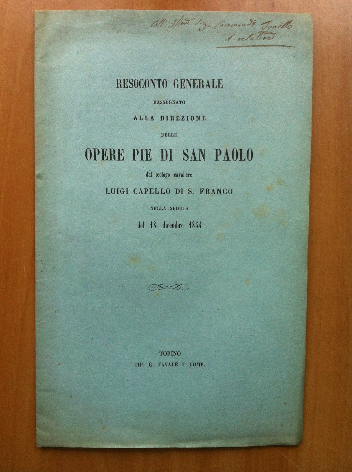 Resoconto generale rassegnaro alla Direzione delleOPERE PIE DI SAN PAOLOdal Teologo cavaliere Luigi Cappello di S. Franco nella seduta del 18 dicembre 185416 pagine - formato 13x21 cmin ottimo stato (15 g)E15887