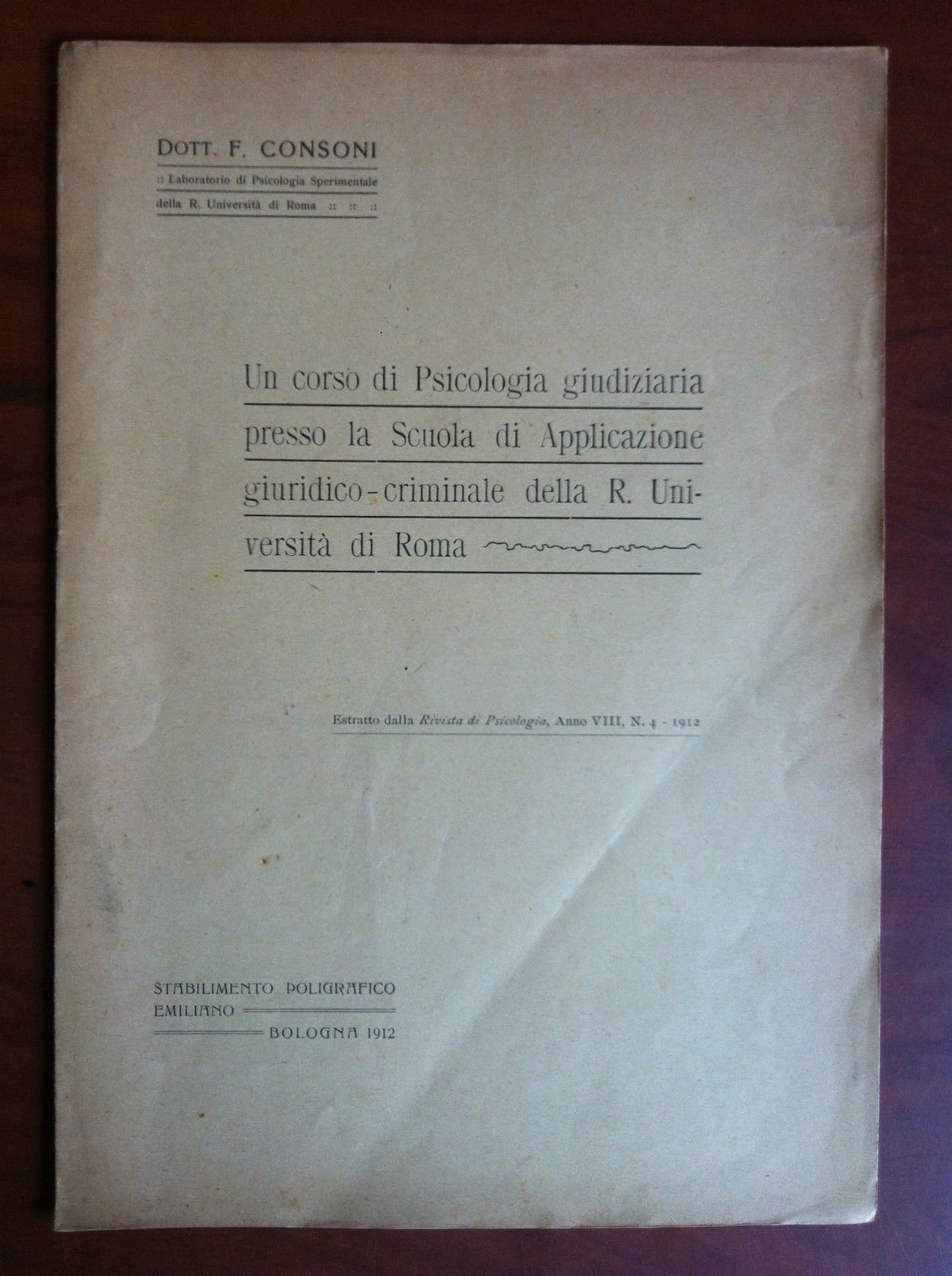 Brossura originaleUn corso di psicologia giudiziaria presso la scuola di Applicazione giuridico-criminale della R. Università di RomaDott. F. ConsonniLaboratorio di Psicologia Sprimentale della R. Università di RomaEstratto dalla Rivista di Psicologia Anno VIII n^ 4 - 19128 pagine - formato 17x24,5 cmin ottime condizioni (25 g)E17817