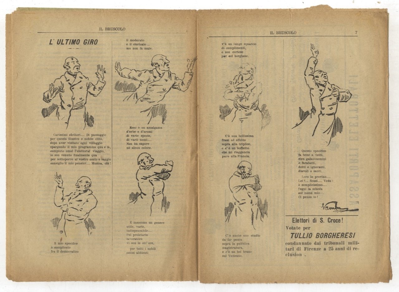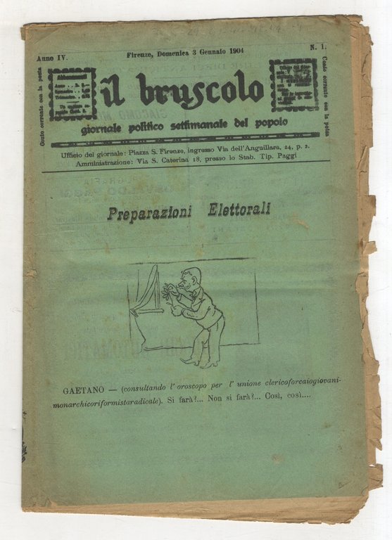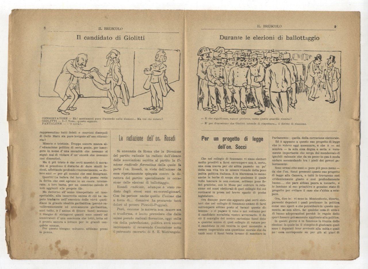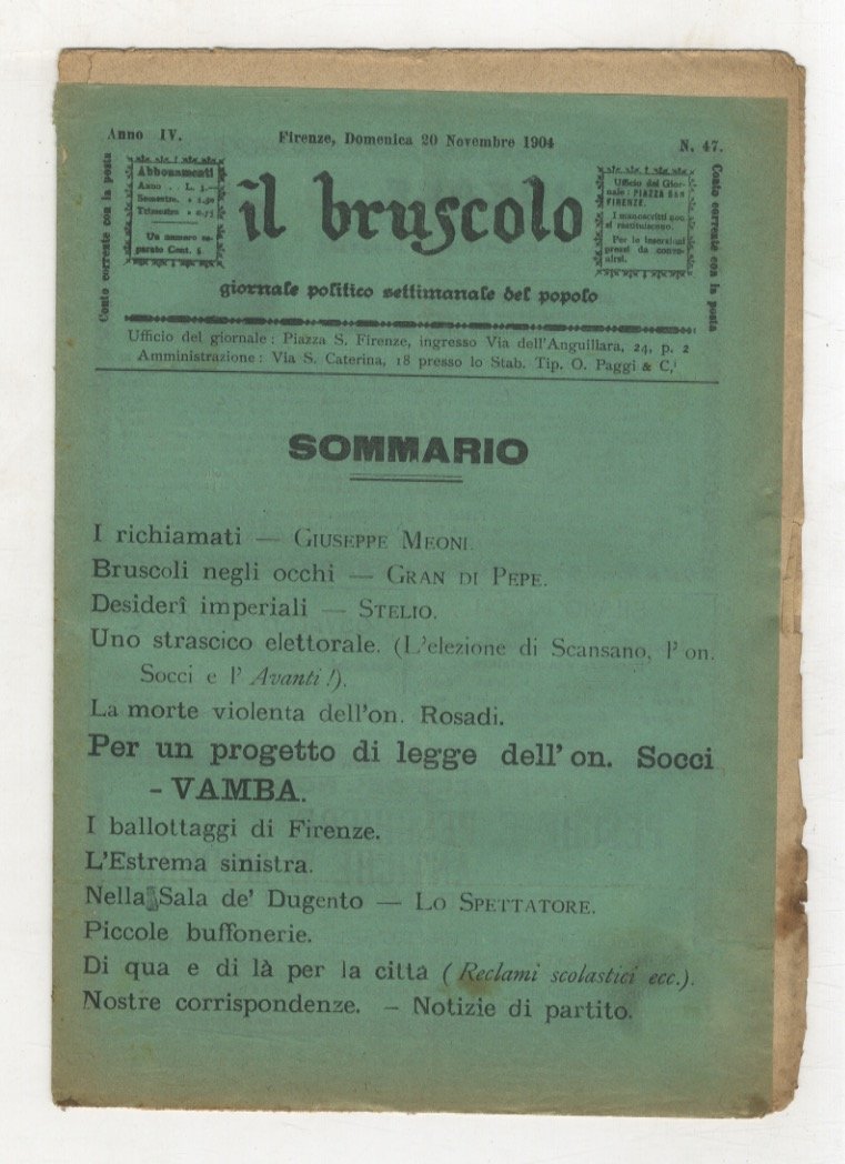 Firenze, Il Bruscolo, 1904, fascicoli 43 in-8, br. editoriale, circa 16 pp. a fascicolo. Con vignette satiriche n.t. e pubblicità. Foglio d'impronta repubblicana, antigiolittiana e anticlericale, si connota per la polemica combattività su temi sia a carattere nazionale (suffragio universale, divorzio, istruzione laica) che locale (funzione educativa del comune, municipalizzazione dei servizi pubblici, autonomia finanziaria dallo stato centrale, ecc.) Fra i collaboratori: Vamba (L. Bertelli), R. Tondi, S. Alessandri, O. Masini, E. Socci, E. Meoni, O. Zuccarini. Mancanze alle brossure, pochi fascicoli senza brossura carte leggermente brunite, sgualciture.