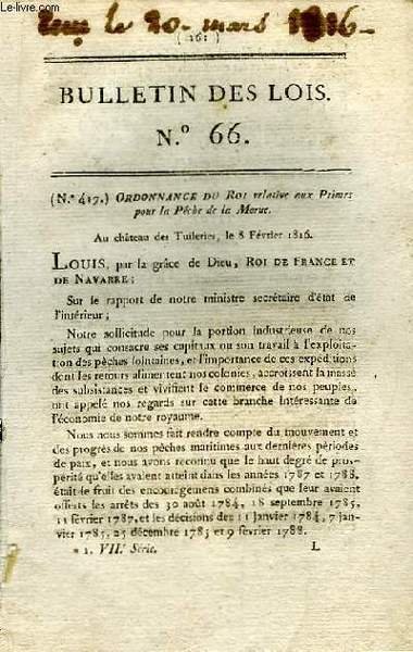 Bulletin des Lois N°66 : Ordonnance du Roi relative aux Primes pour la Pêche de la Morue. Au Château des Tuileries le 8 février 1816