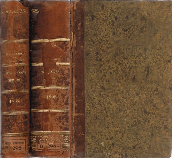 Anno 1898 completo, composto da Tomo XXXV e Tomo XXXVI, rispettivamente di 1042 e 724 pagine, anno LXVIII del periodico mensile Bulletins de l'Académie Royale des Sciences, des Lettres et des Beaux-Arts de Belgique - 3.me série. Due volumi della fine dell'800 in stato discreto, coperta in mezzapelle con angoli, piatti marmorizzati, sul dorso elementi decorativi e caratteri incisi in oro, diversi segni del tempo, fioritura sparsa, tagli bruniti con barbe, pagine in buono stato, margini un po' ambrati, alcune leggermente ambrate con minima presenza di gora. Presentano talloncino in carta con catalogazione bibliotecaria su risguardia; illustrazioni in b. e n. in testo e fuori testo. Numero Pagine 1766