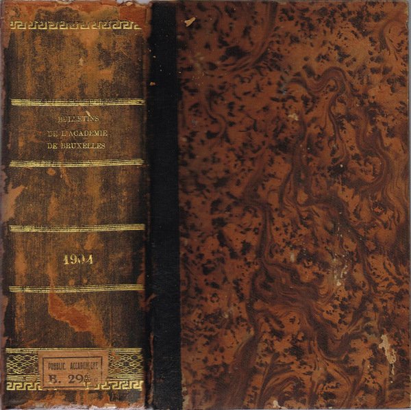 Anno 1904 completo del periodico mensile Bulletins de la classe des Sciences, a cura dell'Académie Royale de Belgique. Volume dei primi del '900 in stato discreto, coperta in mezzapelle con angoli, piatti marmorizzati, sul dorso elementi decorativi e caratteri incisi in oro e talloncino in carta con catalogazione bibliotecaria, diversi segni del tempo, fioritura sparsa, tagli bruniti con barbe, cerniera appena allentata, pagine in buono stato, alcune leggermente ambrate, foglio di guardia staccato dalla legatura. Presenta talloncino in carta con catalogazione bibliotecaria su risguardia, su occhiello catalogazione bibliotecaria in parte manoscritta, timbro "Cambio" ed appunto, figure in nero, II tavole, su carta patinata, con illustrazioni in b. e n., un'altra fuori formato, ben piegata Numero Pagine 1402