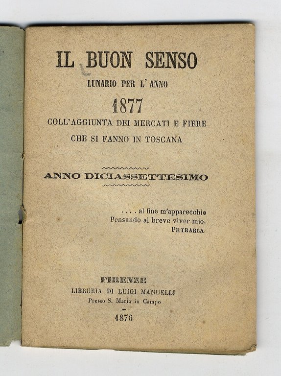 BUON (IL) senso. Lunario per l'anno bisestile 1877. Coll'aggiunta dei mercati e fiere che si fanno in Toscana. Anno diciassettesimo.