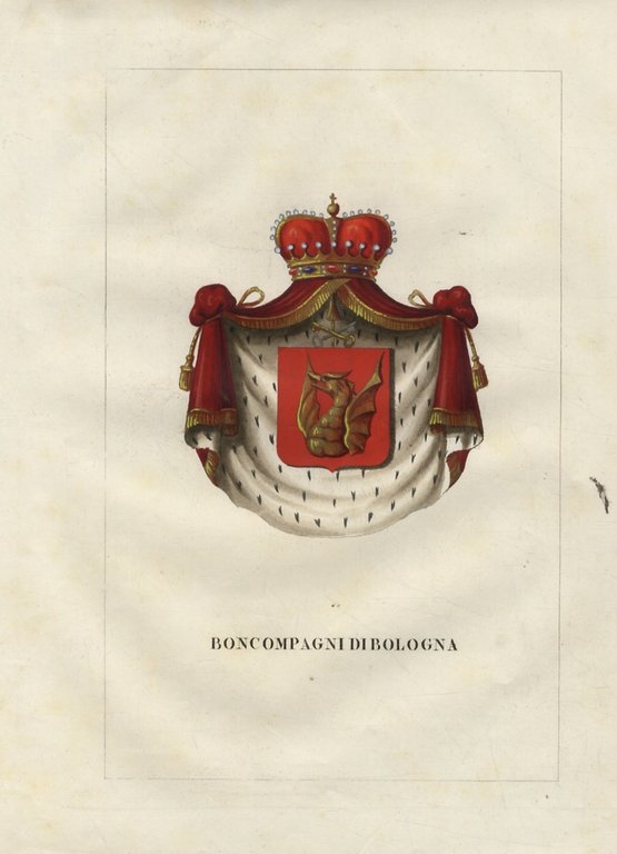Lodi, Wilmant e figli, 1841-1848, in-4, privo di brossura, pp. [10]. Con un bello stemma accuratamente miniato a mano all'epoca, in vividi colori, con particolari dorati, su una tavola f.t. Fascicolo a fogli sciolti, dedicato alla storia della famiglia, tratto da "Teatro araldico, ovvero Raccolta generale delle armi ed insegne gentilizie delle più illustri e nobili casate che esisterono un tempo e che tuttora fioriscono in tutta Italia" di Leone Tettoni e F. Saladini, Lodi, Wilmant e figli, 1841-1848. Ottime condizioni.