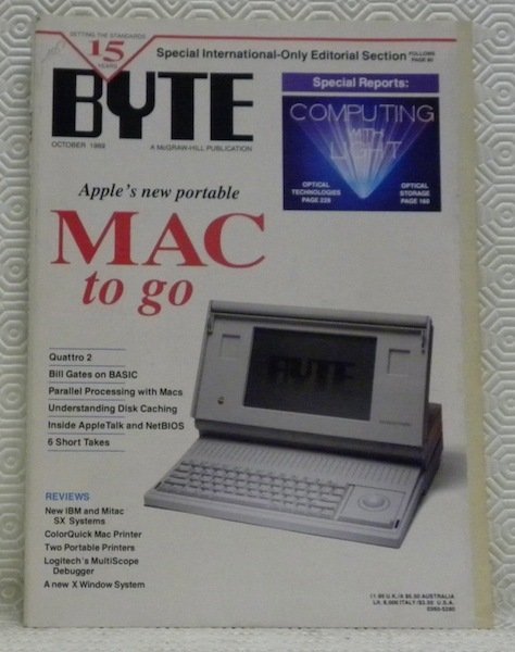 BYTE. The small systems journal. October 1989. Apple’s new portable MAC to go. Quattro 2, Bill Gates on BASIC, Parallel Processing with Macs. Understanding Disk Caching. Inside Apple Talk and NetBIOS, 6 Short Takes. Reviews: New IBM and Mitac SX Systems, ColorQuick Mac Printer, Two Portable Printers, Logitech’s MultiScope Debugger, A new X Window System. Special Reports: Computing with Light: Optical Technologies, Optical Storage.