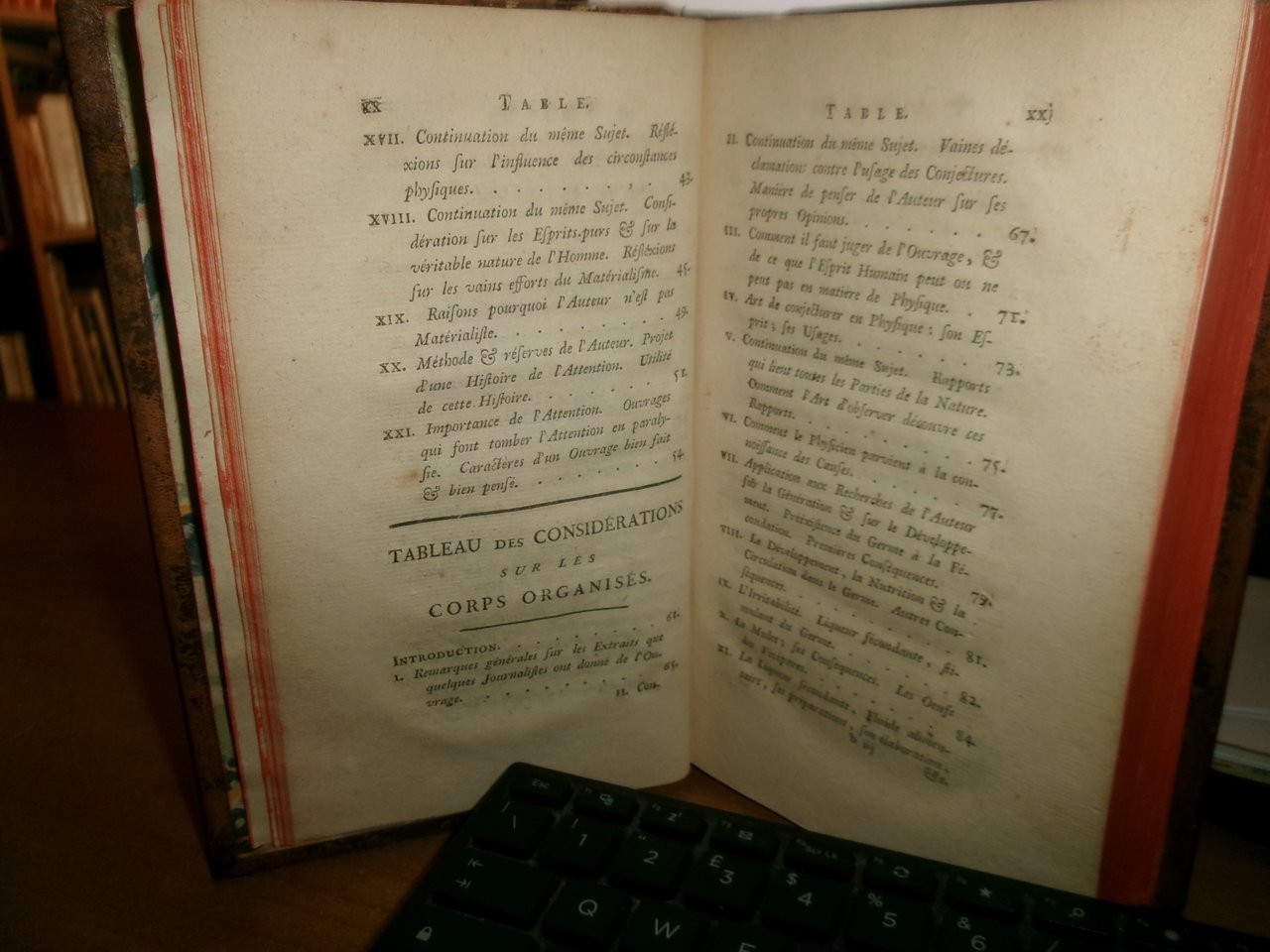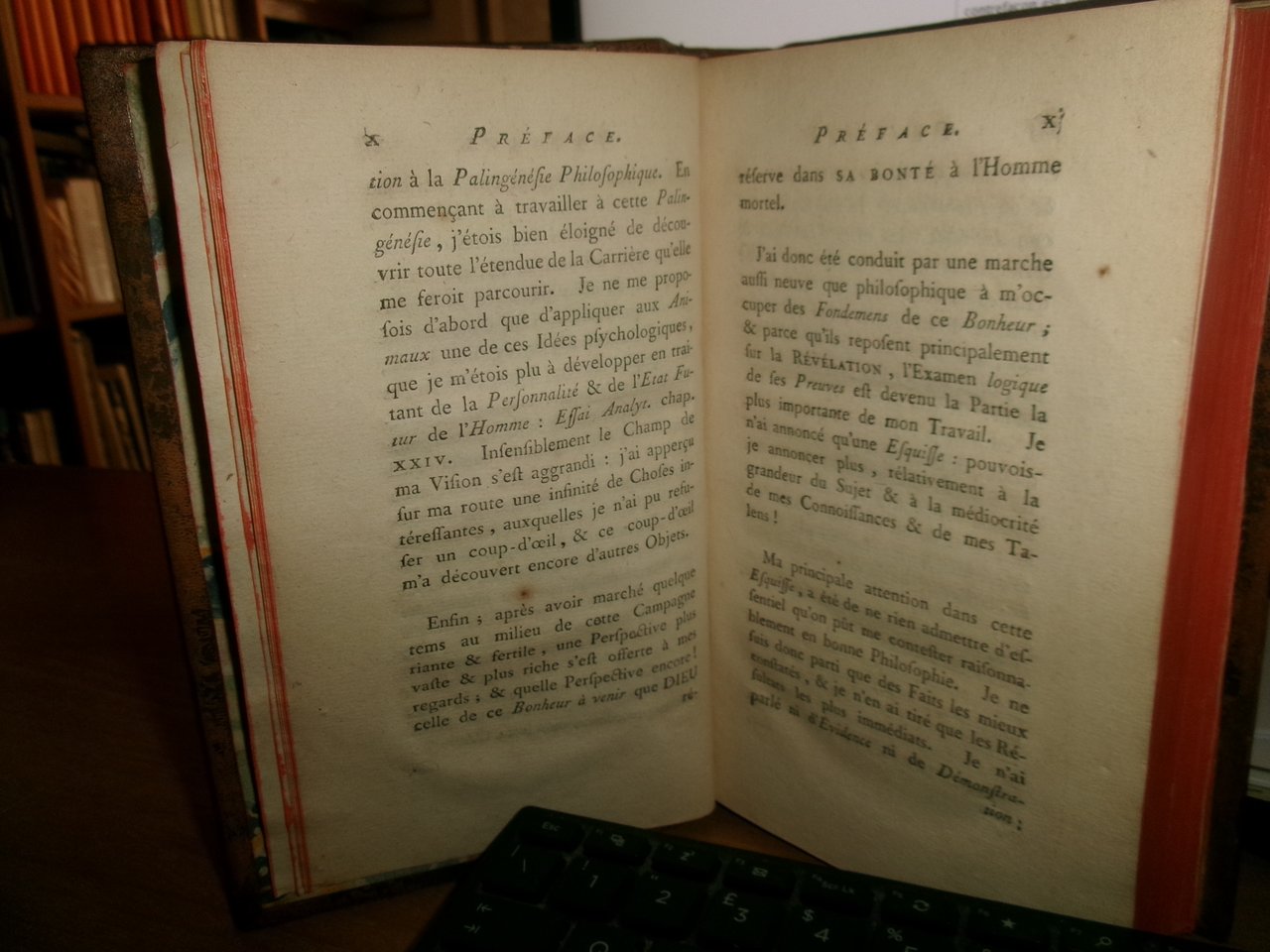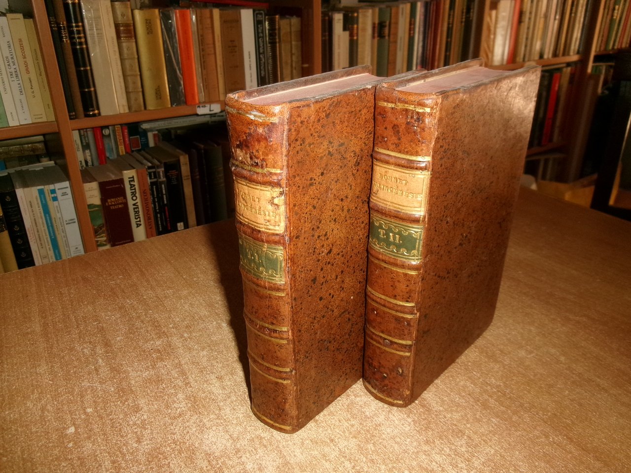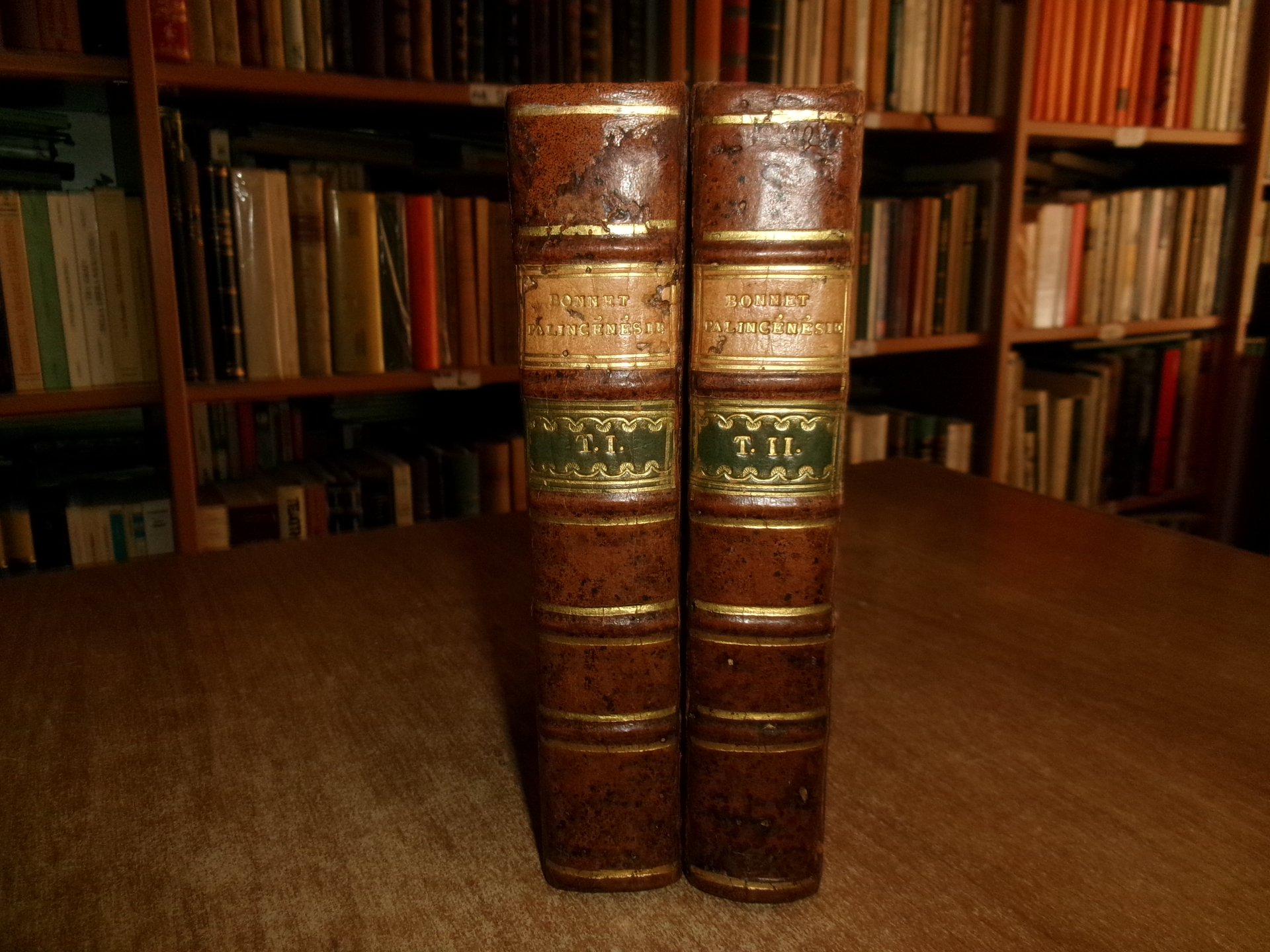 C. BONNET. A Geneve, Chez Claude Philibert et Barthelemi Chirol, 1769. LA PALINGÉNÉSIE PHILOSOPHIQUE, OU IDÉES SUR L'ÉTAT DES ÊTRES VIVANTS. 2 volumi in-8°, piena pelle coeva, dorsi a nervi con fregi e titoli in oro entro tasselli ai dorsi, tagli rossi. I. xxvi, (ii), 427, (1) pp.; II. (ii), iv, 448 pp. Questo lavoro di biologia teorica che attinge la sua origine in un pensiero multidisciplinare e assunzione Leibniz (l'immortalità dell'anima), sostiene che la Terra subisce disastri universali periodici che distruggono quasi tutta la vita e sopravvissuti a salire ogni volta un passo sulla scala dell'evoluzione. Bonnet fu il primo ad usare il termine evoluzione in un contesto biologico. Il libro delinea anche la psicologia sperimentale. Esiste in ogni essere germi che lo precedono e garantisce la sopravvivenza della specie, il Bonnet tesi annunciando le teorie e le scoperte di geni. Questa è la cecità in Bonnet porre fine agli esperimenti e ha invitato alla riflessione filosofica. - [FRENCH VERSION FOLLOWS] Édition originale, assez rare ; une contrefaçon est parue à la même date à Amsterdam. Sans aucun doute la plus ambitieuse et la plus remarquable étude de Bonnet qui lui valut l'appellation de père de la biologie moderne. Cette oeuvre de biologie théorique puisant sa source dans une réflexion multi-disciplinaire et son postulat chez Leibniz (l'immortalité de l'âme) prétend que la Terre subit périodiquement des catastrophes universelles qui détruisent presque toute vie et que les survivants montent chaque fois d'un degré sur l'échelle de l'évolution. Bonnet fut le premier à utiliser le terme d'évolution dans un contexte biologique. L'ouvrage préfigure également la psychologie expérimentale. Il existerait en chaque être des germes qui lui préexistent et assure la survie de l'espèce, la thèse de Bonnet annonçant les théories et découvertes des gènes. C'est la cécité qui chez Bonnet mit un arrêt aux expérimentations et l'engagea sur la voie de la réflexion philosophique. Bell' esemplare dell' edizione originale con firma du Compte Jean Baptiste Giovio 1770. Neg. mens. bianca cassa.