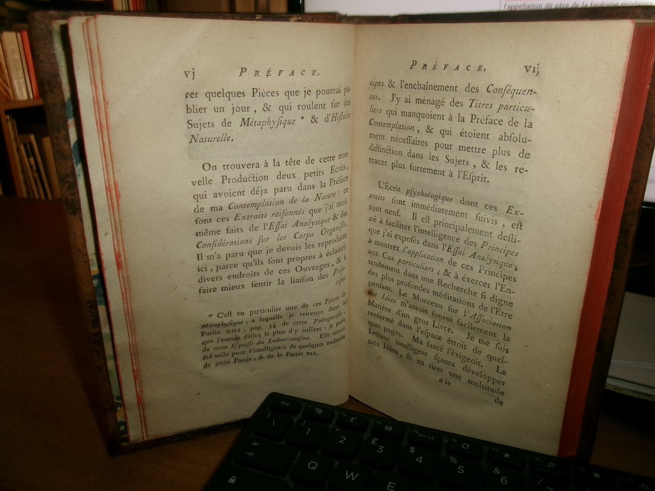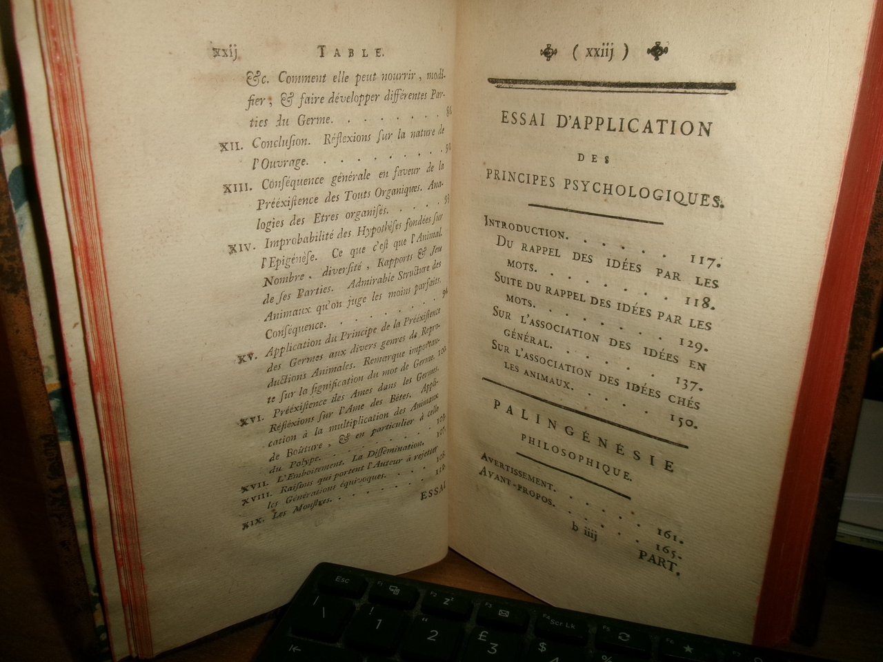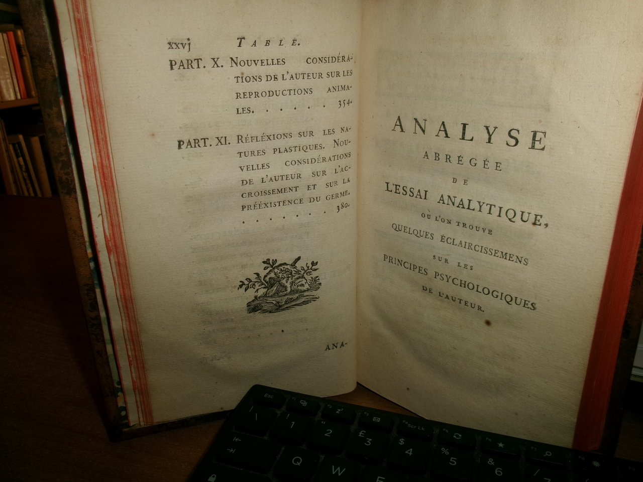 C. BONNET. A Geneve, Chez Claude Philibert et Barthelemi Chirol, 1769. LA PALINGÉNÉSIE PHILOSOPHIQUE, OU IDÉES SUR L'ÉTAT DES ÊTRES VIVANTS. 2 volumi in-8°, piena pelle coeva, dorsi a nervi con fregi e titoli in oro entro tasselli ai dorsi, tagli rossi. I. xxvi, (ii), 427, (1) pp.; II. (ii), iv, 448 pp. Questo lavoro di biologia teorica che attinge la sua origine in un pensiero multidisciplinare e assunzione Leibniz (l'immortalità dell'anima), sostiene che la Terra subisce disastri universali periodici che distruggono quasi tutta la vita e sopravvissuti a salire ogni volta un passo sulla scala dell'evoluzione. Bonnet fu il primo ad usare il termine evoluzione in un contesto biologico. Il libro delinea anche la psicologia sperimentale. Esiste in ogni essere germi che lo precedono e garantisce la sopravvivenza della specie, il Bonnet tesi annunciando le teorie e le scoperte di geni. Questa è la cecità in Bonnet porre fine agli esperimenti e ha invitato alla riflessione filosofica. - [FRENCH VERSION FOLLOWS] Édition originale, assez rare ; une contrefaçon est parue à la même date à Amsterdam. Sans aucun doute la plus ambitieuse et la plus remarquable étude de Bonnet qui lui valut l'appellation de père de la biologie moderne. Cette oeuvre de biologie théorique puisant sa source dans une réflexion multi-disciplinaire et son postulat chez Leibniz (l'immortalité de l'âme) prétend que la Terre subit périodiquement des catastrophes universelles qui détruisent presque toute vie et que les survivants montent chaque fois d'un degré sur l'échelle de l'évolution. Bonnet fut le premier à utiliser le terme d'évolution dans un contexte biologique. L'ouvrage préfigure également la psychologie expérimentale. Il existerait en chaque être des germes qui lui préexistent et assure la survie de l'espèce, la thèse de Bonnet annonçant les théories et découvertes des gènes. C'est la cécité qui chez Bonnet mit un arrêt aux expérimentations et l'engagea sur la voie de la réflexion philosophique. Bell' esemplare dell' edizione originale con firma du Compte Jean Baptiste Giovio 1770. Neg. mens. bianca cassa.