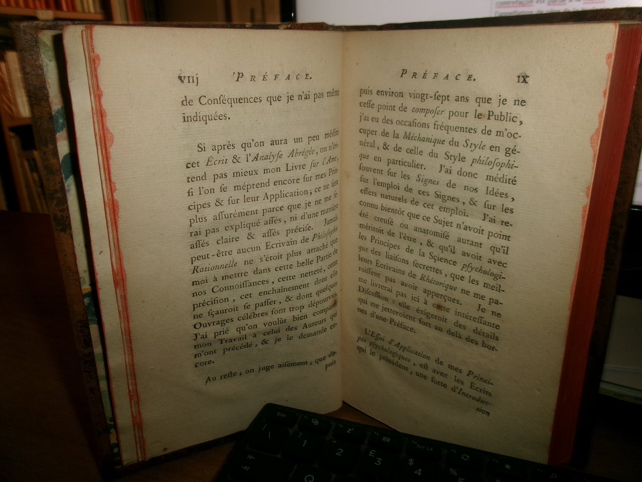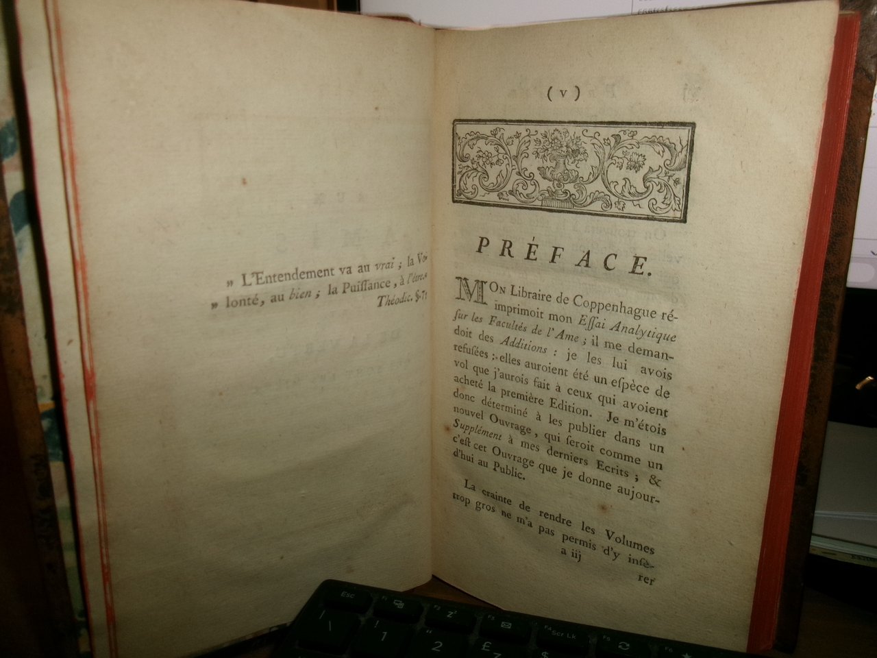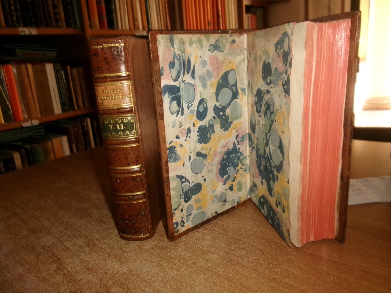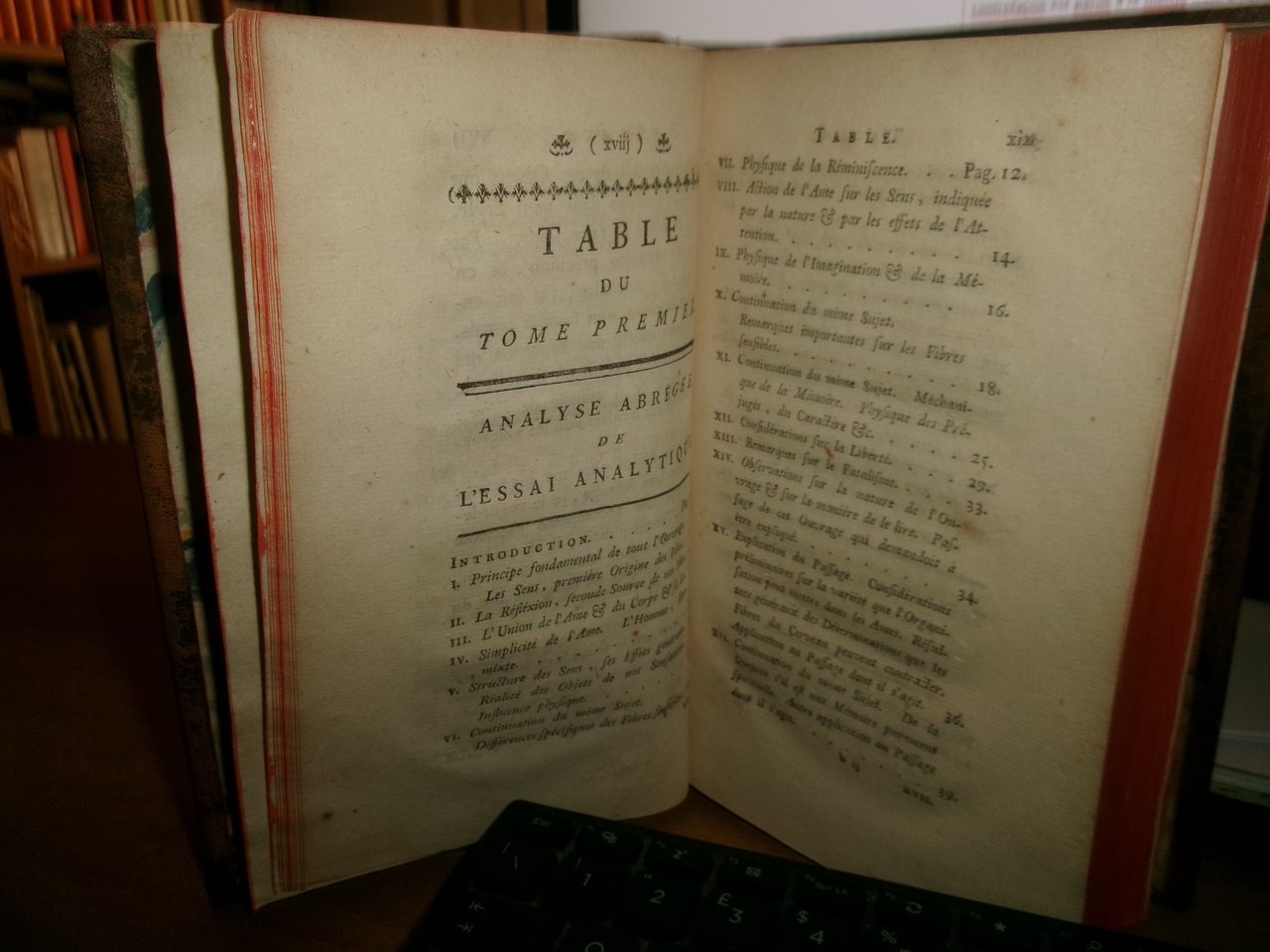C. BONNET. A Geneve, Chez Claude Philibert et Barthelemi Chirol, 1769. LA PALINGÉNÉSIE PHILOSOPHIQUE, OU IDÉES SUR L'ÉTAT DES ÊTRES VIVANTS. 2 volumi in-8°, piena pelle coeva, dorsi a nervi con fregi e titoli in oro entro tasselli ai dorsi, tagli rossi. I. xxvi, (ii), 427, (1) pp.; II. (ii), iv, 448 pp. Questo lavoro di biologia teorica che attinge la sua origine in un pensiero multidisciplinare e assunzione Leibniz (l'immortalità dell'anima), sostiene che la Terra subisce disastri universali periodici che distruggono quasi tutta la vita e sopravvissuti a salire ogni volta un passo sulla scala dell'evoluzione. Bonnet fu il primo ad usare il termine evoluzione in un contesto biologico. Il libro delinea anche la psicologia sperimentale. Esiste in ogni essere germi che lo precedono e garantisce la sopravvivenza della specie, il Bonnet tesi annunciando le teorie e le scoperte di geni. Questa è la cecità in Bonnet porre fine agli esperimenti e ha invitato alla riflessione filosofica. - [FRENCH VERSION FOLLOWS] Édition originale, assez rare ; une contrefaçon est parue à la même date à Amsterdam. Sans aucun doute la plus ambitieuse et la plus remarquable étude de Bonnet qui lui valut l'appellation de père de la biologie moderne. Cette oeuvre de biologie théorique puisant sa source dans une réflexion multi-disciplinaire et son postulat chez Leibniz (l'immortalité de l'âme) prétend que la Terre subit périodiquement des catastrophes universelles qui détruisent presque toute vie et que les survivants montent chaque fois d'un degré sur l'échelle de l'évolution. Bonnet fut le premier à utiliser le terme d'évolution dans un contexte biologique. L'ouvrage préfigure également la psychologie expérimentale. Il existerait en chaque être des germes qui lui préexistent et assure la survie de l'espèce, la thèse de Bonnet annonçant les théories et découvertes des gènes. C'est la cécité qui chez Bonnet mit un arrêt aux expérimentations et l'engagea sur la voie de la réflexion philosophique. Bell' esemplare dell' edizione originale con firma du Compte Jean Baptiste Giovio 1770. Neg. mens. bianca cassa.