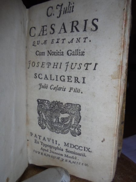Cesare C.G.C. C.Iulii Caesaris. Patavii, ex Typ. Seminarii, 1709. C. Iulii Caesaris quae extant cum notitia Galliae Iosephi Scaligeri. In-16° antico, pergamena coeva un po stanca. (6), 686, (72) pp. In buono stato di conservazione. Neg. mob. nero 9