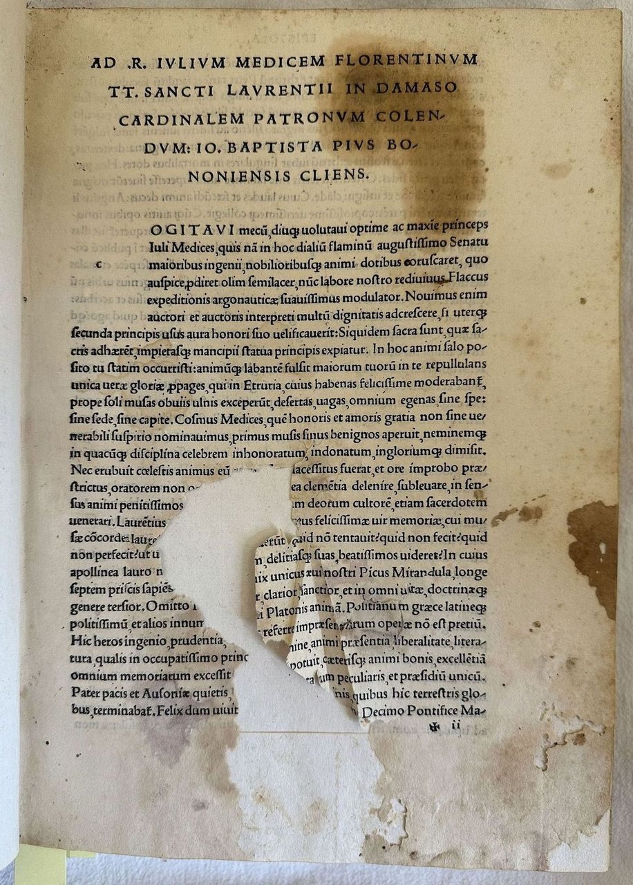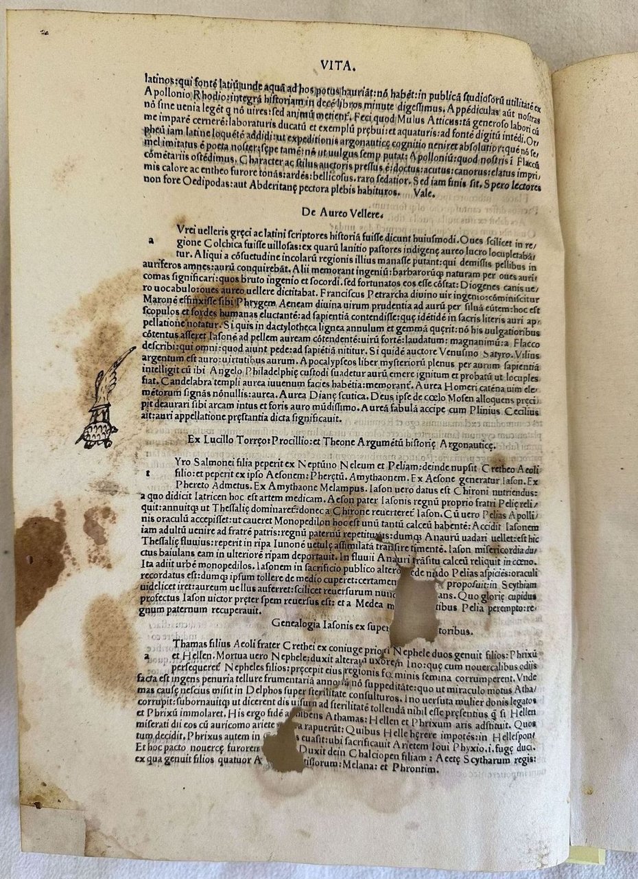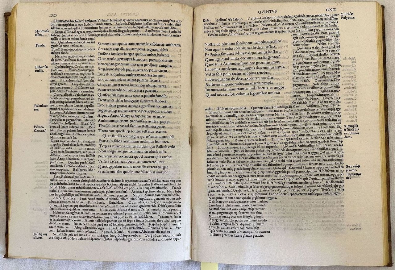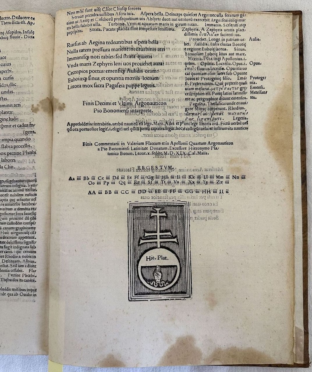 Pregevole edizione del Maggio 1519, variante B, curato dall'umanista bolognese Giovanni Battista Pio (ca 1470-1540) del poema epico "Argonautica" composto dal poeta latino Valerio Flacco nato a Sezze e morto intorno al 92 (Cfr. EDIT16 web). L'"editio princeps" di Valerio Flacco fu pubblicata a Bologna nel 1474, ma G.B. Pio trovò nuovi codici e ripubblicò il testo con gli ultimi due canti che mancavano e con l'aggiunta dell'Argonautica di Apollonio Rodio, utilizzata per integrare e condurre a conclusione la narrazione di Valerio Flacco che si interrompeva all'ottavo libro. Caratteri romani con commento in cornice in latino e greco. Dati editoriali indicati alla carta 2i2r. Insieme al volume un antico foglio con note manoscritte. "On fait grand cas de cette édition, qui est belle et fort rare". Graesse, VII/241: "Nouvelle récension du texte sur de bons mss., probablement sur un manuscrit de Matthias Corvinus. L'auteur de la version latine d'Orphée fut Leodrisius Cribellus". Manca ad Adams e S.T.C. In discrete condizioni ma completo. Copertina ottocentesca in mezza pelle con titolo e decorazioni in oro su tassello al dorso in ottime condizioni generali con lievi usure marginali. Legatura in buone condizioni. All'interno le pagine si presentano in buone condizioni con fioriture e bruniture marginali. Frontespizio e prime quattro carte presentano mancanze con perdita di testo (le pagine rovinate sono state intervallate da fogli bianchi). Eccessiva rifilatura al margine superiore di pag. CLXV, CLXXXVIII, CLXXXIX con perdita dei numeri di pagina. L'indice è stato rilegato all'inizio dell'opera anzichè alla fine. Bruniture. In 4. Dim. 29,5x21,5 cm. Pp. (20)+CLXXXIX+(1).Peso Kg. 1,00Scarce post incunable of May 1519, variant B, of the epic poem "Argonautica" written by the latin poet Valerio Flacco born in Sezze and dead around 92 (Cfr. EDIT16 web). The work contains also the fourth book of'"Argonautica" by Apollonio Rodio, used to integrate and finish the narration of "Argonautica" by Valerio Flacco which was interrupted at 8th book. Latin text with comment in latin and greek of Giovanni Battista Pio (1540 m.). Editorial information in page 2i2r. Together with the volume and antique page with handwritten notes. In fair conditions but complete. half leather cover of 19th century with gilted title and decorations in the spine in very good general conditions lightly worn in the extremities. Binding in good conditions. Inside pages are in good conditions with foxing and yellowing in the extremities. Title page and first four pages with lackings and loss of text (between the ruined pages there are some blank pages). Upper edge of pag. CLXV, CLXXXVIII, CLXXXIX has been excessively cut with loss of number of pages. The index has been bound at the beginning of the work instead of the end. Yellowings. In 4. Dim. 29,5x21,5 cm. Pp. (20)+CLXXXIX+(1).Peso Kg. 1,00<BR><BR>