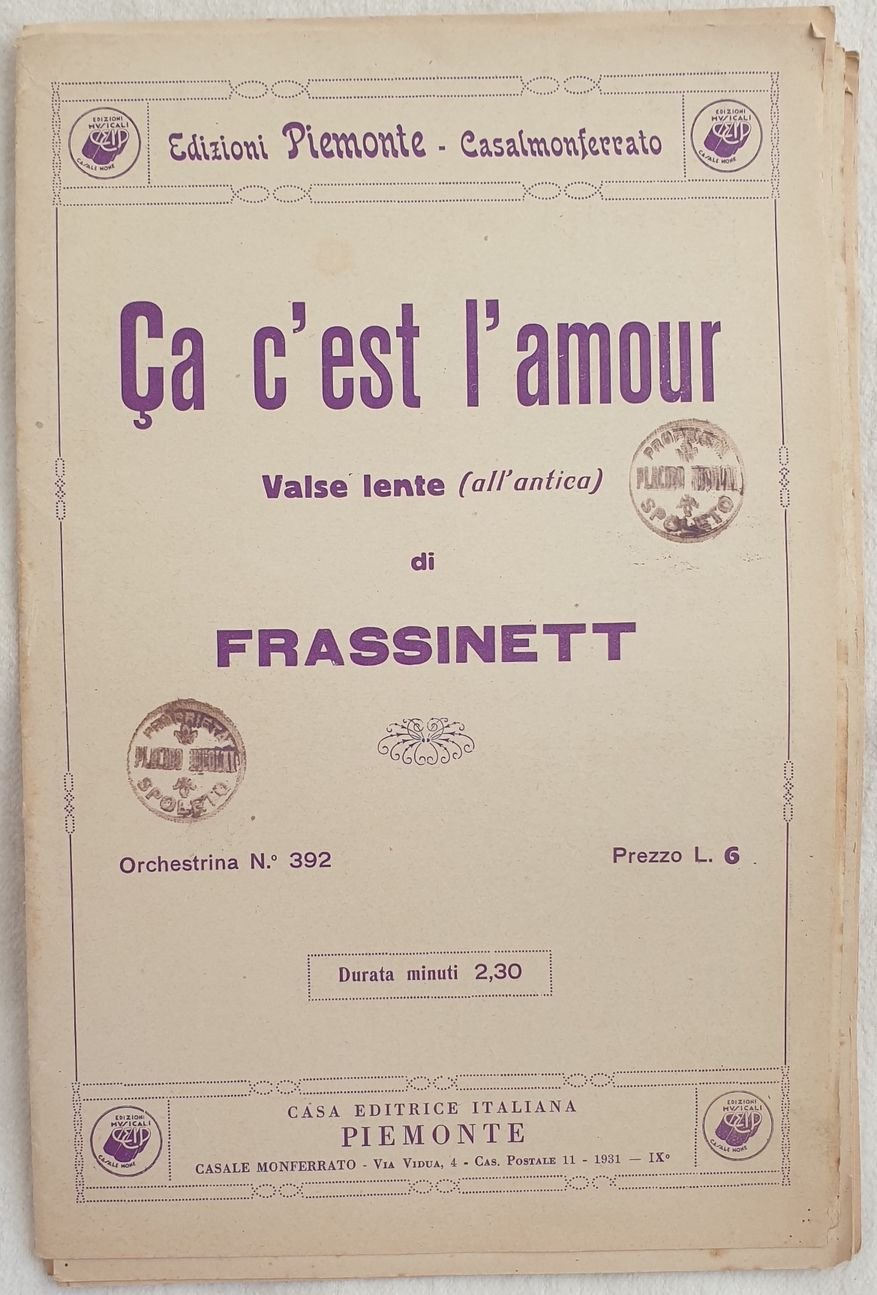 Partitura per orchestra del 1931 della melodia "Ca c'est l'amour" di Frassinett.<BR>Copertina morbida editoriale. GENERE: Valzer STRUMENTI: pianoforte, violino, viola, violoncello, contrabasso, sassofono, tromba, batteria<BR>ANNO: 1931 DIMENSIONI: In 8. cm 27x17,5 PAGINE: pp. 17 CONDIZIONI: Buone condizioni. Complete score for orchestra of 1931 of the melody "Ca c'est l'amour" by Frassinett. Editorial soft cover. MUSIC: Valzer STRUMENTI: piano, violin, violoncello, contrabass, saxophone, trumpet, drums<BR>YEAR: 1931 SIZE: In 8. cm 27x17,5 PAGES: pp. 17 CONDITIONS: Good conditions.