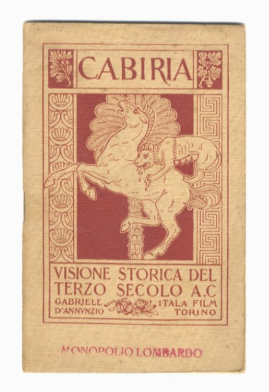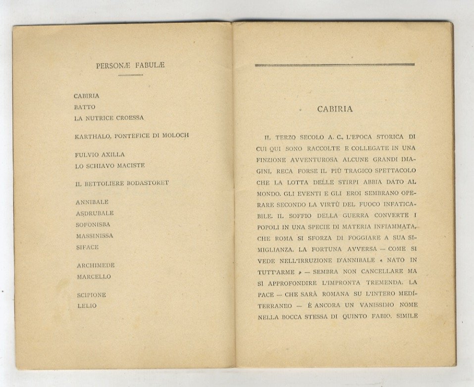 Torino, Itala Film (Stab. Tipo-Litografico Toffaloni), 1914, in-16, br. editoriale con copertina anteriore figurata, pp. 31, [1]. Didascalie del film "Cabiria" per la regia di Giovanni Pastrone. Prima edizione nella variante in-16. Esemplare in ottimo stato. Guabello 234.