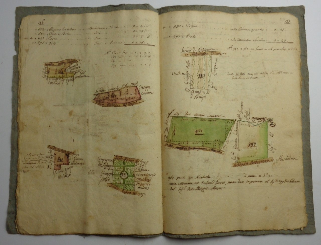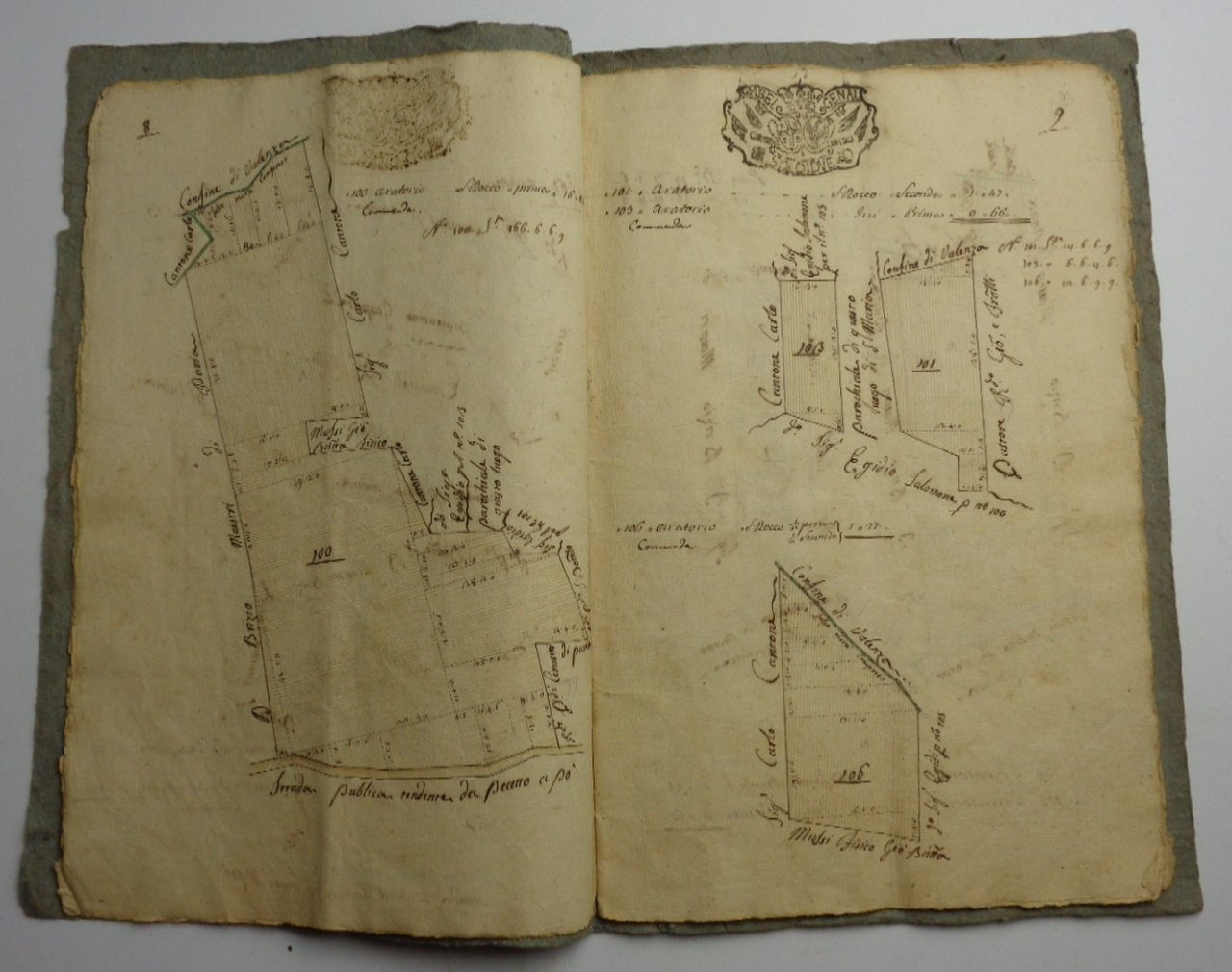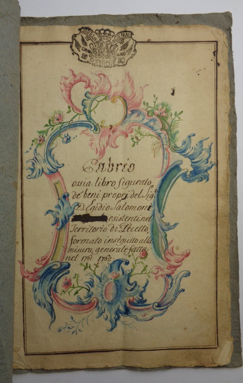 Antico Cabreo manoscritto, con titolo in cornice floreale disegnata e colorata: Cabrio ossia libro figurato de' beni proprj del Sig. D. Egidio Salomoni esistenti nel Territorio di Pecetto, formato in seguito alla misura generale fatta nel 1761. 1762. Composto da 38 pagine: oltre al titolo, 36 pagine con rilievo colorato degli appezzamenti di terreno della proprietà, indicazione delle colture con segni (alberi, tratti, canali), nomi delle proprietà confinanti. Notevoli estensioni di vigna. Bollo di gabella (soldi due) ad ogni pagina. Legatura coeva, brossura di carta grigia, legato con filo, scritta alla copertina Antico Cabreo. Dimensioni di ciascuna delle 38 pagine 21x33 cm. Calligrafie perfettamente leggibili. Ottimo stato di conservazione.