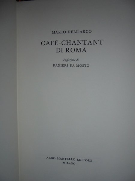 Mario Dell' Arco. Milano, Aldo Martello Editore, 1970. Café-Chantant di Roma. Prefazione di Ranieri Da Mosto. In-8°, tela edit. XV,136 pp. con illustrazioni la maggior parte a colori (alcune applicate) n.t. Esemplare come nuovo. Neg. Bol. mob. S. carc.