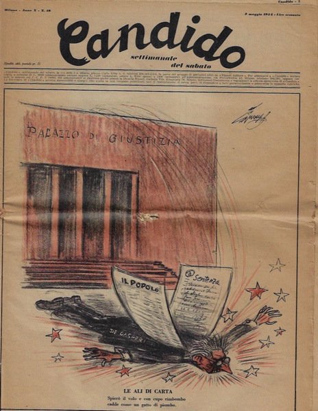 Numero 18 di "Candido", (anno X, 2 maggio 1954). Condizioni generali discrete, evidenti segni del tempo, esemplare brunito, con strappi e lacune, segni di piegature. Numero pagine 32.