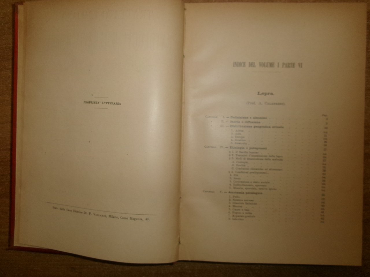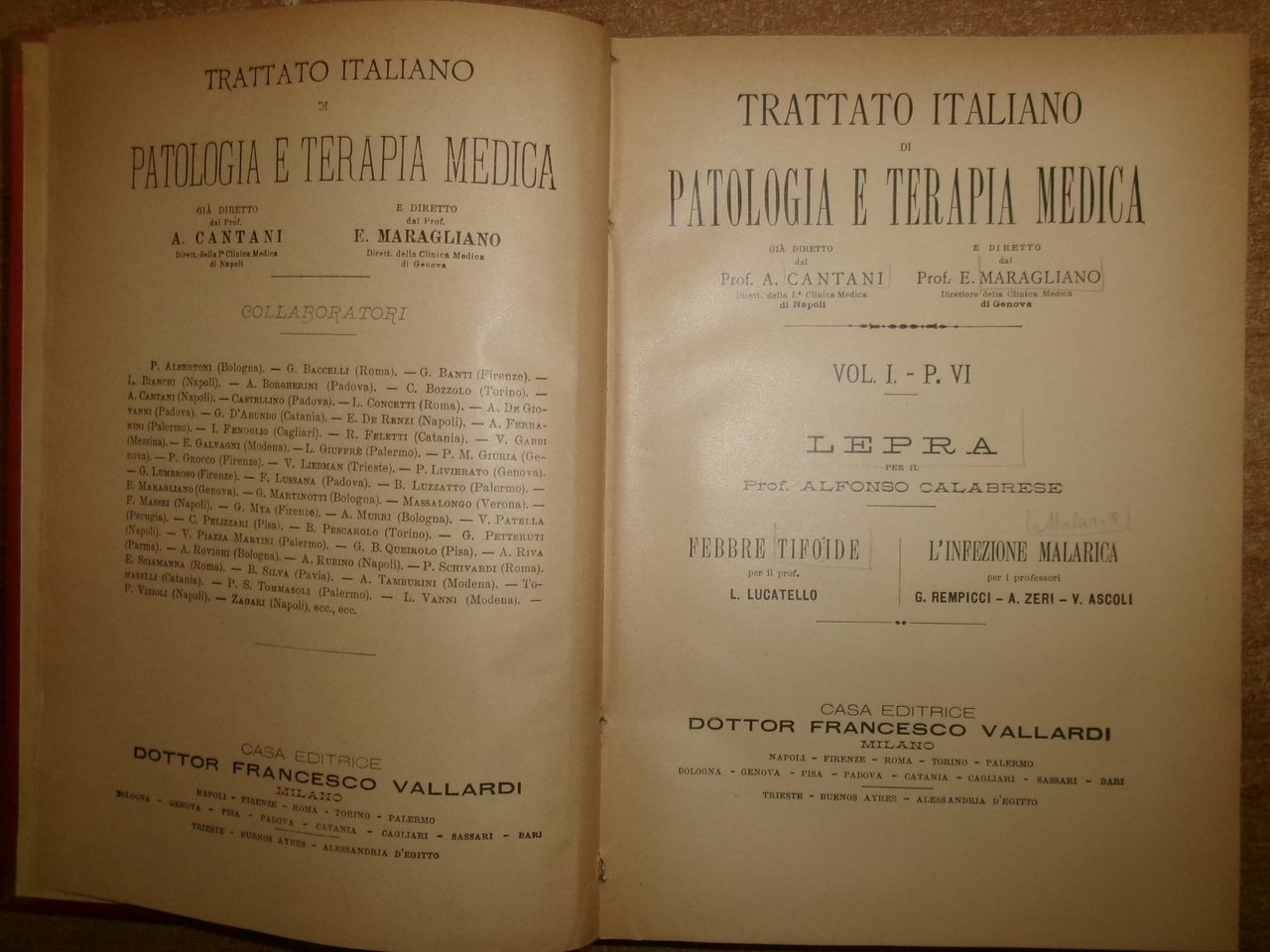 CANTANI - MARAGLIANO. Trattato Italiano Di Patologia E Terapia... Vol. I - P. VI. Milano, Francesco Vallardi, (s.d. fine 800'). LEPRA - FEBBRE TIFOIDE - L' INFEZIONE MALARICA. In-8°, tela edit con titolo in oro sul dorso. xii, 7 pp. (indice degli Autori). 454 pp. con alcune figure in nero n.t. Ben conservato. Uff. salon. sporta 6