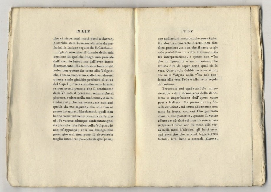 Parma, co' tipi bodoniani, 1800, in-8 piccolo, br. muta coeva, pp. [4], XLVI, [2], 55, [1], la prima carta bianca. Euforbo Melesigenio è pseudonimo di Tommaso Valperga di Caluso. Brooks n. 781: “La dedica è Al nobil uomo il Sig. conte Vittorio Alfieri (datata Torino 24 giugno 1800) [.]”. Piccole macchioline puntiformi su frontespizio, per il resto ottimo esemplare, a pieni margini.