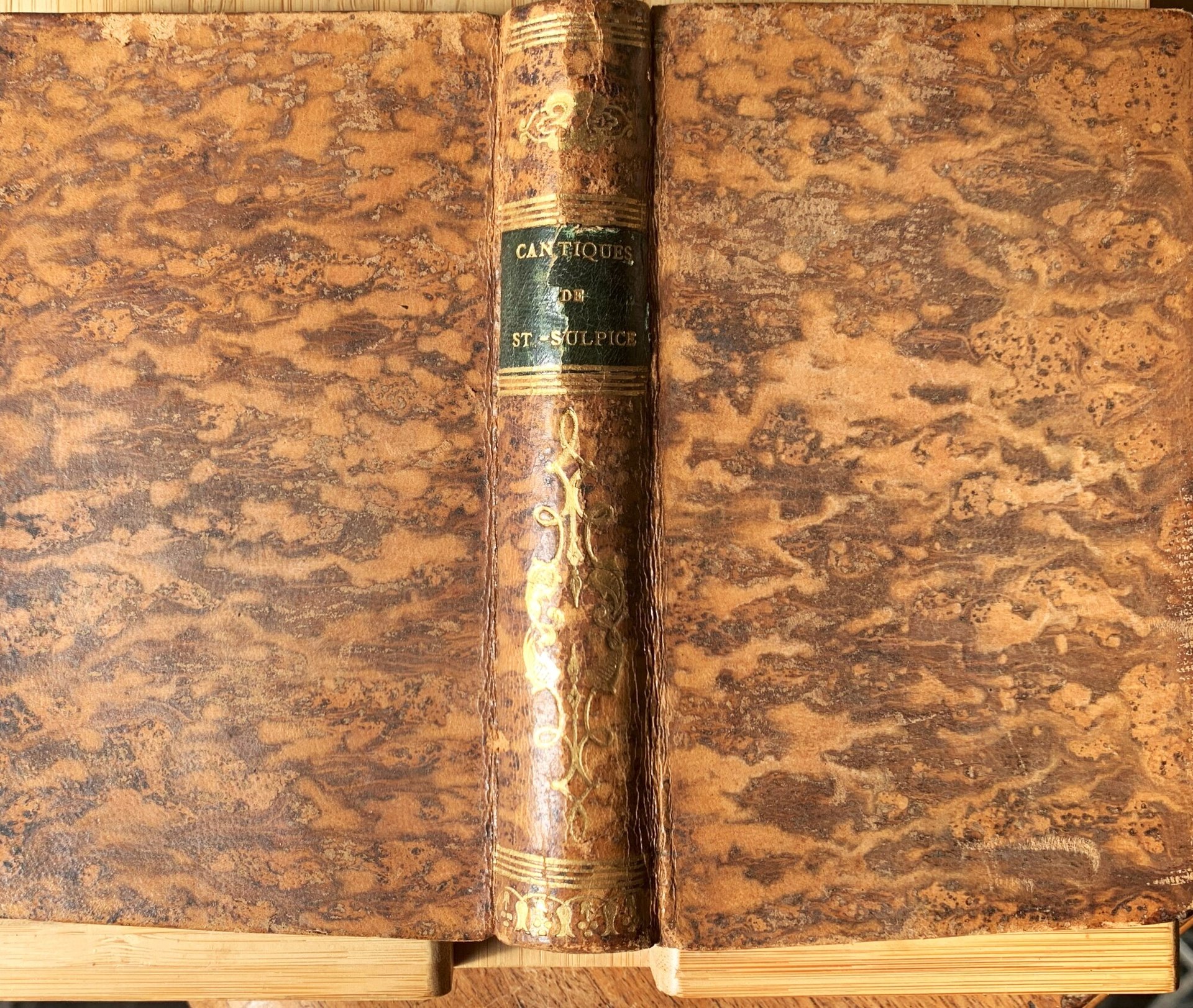 Testo in francese. Rilegatura in-XXIV in pelle marmorizzata marrone con ornati dorati al dorso e con titoli dorati entro tassello in pelle scura al dorso raccoglie due volumi. Tagli e sguardie marmorizzati. Stato buono (leggera usura della copertina - pagine leggermente brunite). 1. Cantiques de Saint-Sulpice. Manuel des Catéchismes de Première Communion et de Persévérance a l'usage des Paroisses et des Maisons d'Éducation, Paris, Librairie de Mme Ve Poussielgue-Rusand (Rue Cassette, 27) - Imp. V, Goupy et Cie (rue Garancière, 5) 1864, pp. (2)+380: Usage que l'on doit faire de ce manuel; Exercices généraux des catéchismes - Exercices et pratiques de piété pour la sanctification de la journée - Exercices de piété pour les catéchismes du dimanche - Psaumes, hymnes et proses que l'on chante aux vèpres et aux saluts - Catéchismes de semaine - Retraite de la première communion - La confirmation - Pratiques de dévotion - Cantiques à l'usage des catéchismes. Cantiques préliminaires - Cantiques sur le service de Dieu - Cantiques sur le ffête de la Petite-Oeuvre - Cantiques pours les jours de fête ou il y a communion du mois - Cantiques pour la bénédiction du Saint-Sagrement - Cantiques pour la retraite, la première communion et la confirmation --- Nouveau recueil d'airs notés pour les Cantiques de Saint-Sulpice. Seul adopté dans les Catéchismes de cette Paroisse, Paris, Librairie de Mme Vve Poussielgue-Rusand (Rue Saint-Sulpice, 23) 1861, pp. 52: Avertissement et partitions.