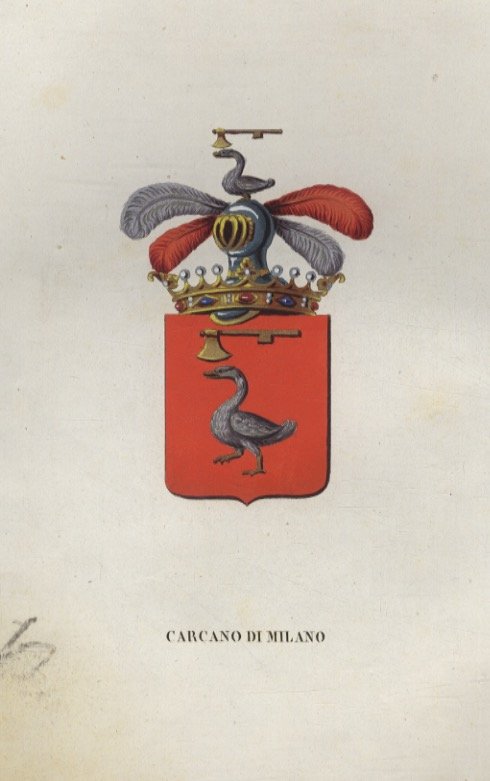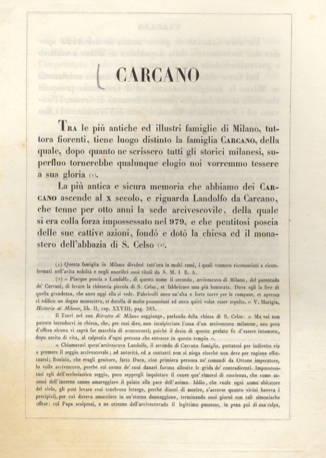Lodi, Wilmant e figli, 1841-1848, in-4, privo di brossura, pp. [8]. Con uno stemma accuratamente miniato a mano all'epoca, in vividi colori, su una tavola f.t. Fascicolo a fogli sciolti, dedicato alla storia della famiglia, tratto da "Teatro araldico, ovvero Raccolta generale delle armi ed insegne gentilizie delle più illustri e nobili casate che esisterono un tempo e che tuttora fioriscono in tutta Italia" di Leone Tettoni e F. Saladini, Lodi, Wilmant e figli, 1841-1848.