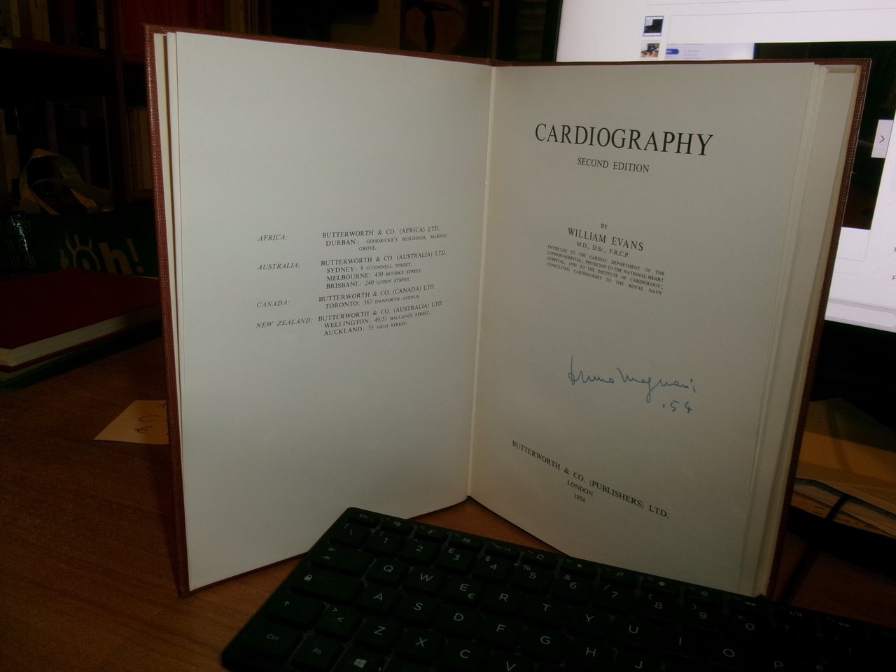By WILLIAM EVANS. London, Butterworth & Co., 1954. CARDIOGRAPHY Second Edition. In-8°, tela edit. con titoli in oro. xiii, 212 pp. + 21 pp. (indice), con numerose figure in nero n.t. In ottimo stato di conservazione con firma di ex proprietario nel frontespizio. Uff. C - I - 3