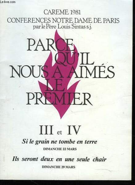 CAREME 1981. CONFERENCES NOTRE DAME DEPARIS. PARCEQU'IL NOUS A AIME LE PREMIER. III ET IV. SI LE GRAIN NE TOMBE ENTERRE / ILS SERONT DEUX EN UNE SEULE CHAIR.