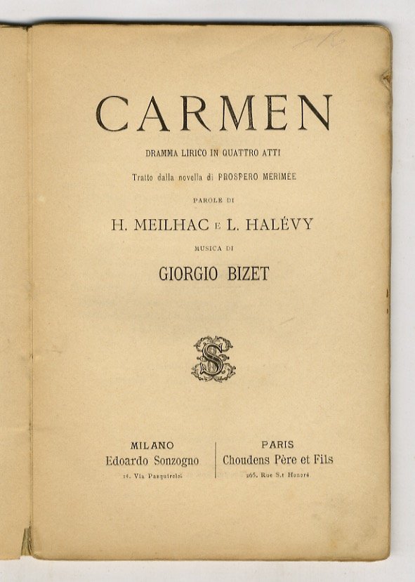 Carmen. Dramma lirico in quattro atti. Tratto dalla novella di Prospero Mérimée. Parola di H. Meilhac e L. Halévy. Musica di Giorgio Bizet.