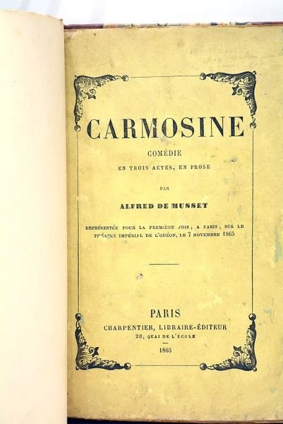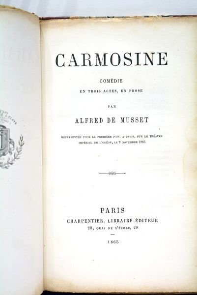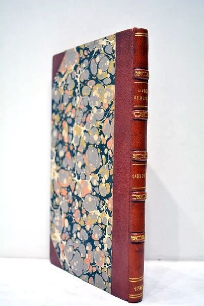 88 pages. (19x12cm). Demi-maroquin à coins. Dos à nerfs orné. Plats et gardes marbrés. Couverture conservée. Paier bruni sur les marges. Peite marque de mouillure claire. Couverture usagée à l'intérieur. Très bon état. Exemplaire très bien relié de la première édition de cette comédie d'amour, une des dernières d'Alfred de Musset. A la fin, catalogue d'éditeur de 10 pages auquel il manque 2 feuillets.